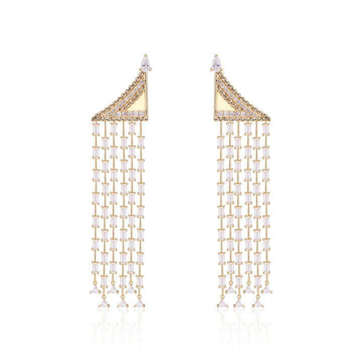 These chandelier earrings are 18K Gold plated over metal and are set with white cubic zirconia. The specific base metal is not explicitly stated.