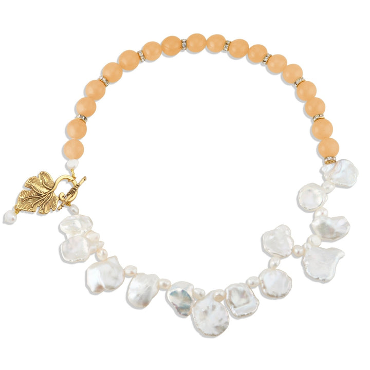 This pearl necklace is handmade with natural cultured freshwater keshi and baroque pearls with quartz beads. It features an antique-look toggle clasp with a leaf motif.