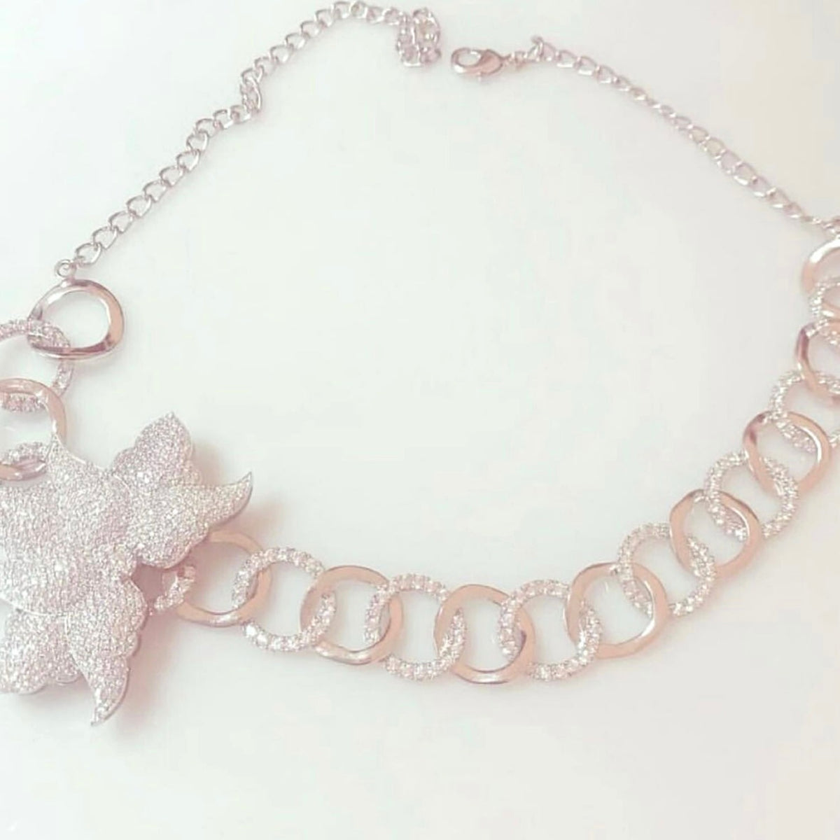 This choker necklace and brooch is a convertible piece. The materials are not explicitly stated, but the description mentions gem studded.