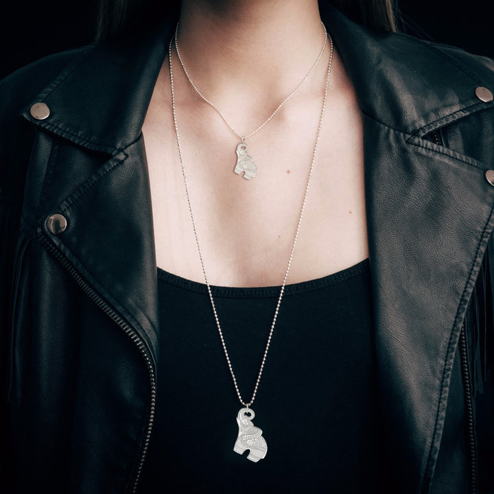 The necklace features a small elephant pendant.