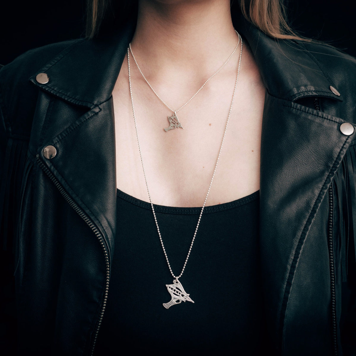 The pendant and chain are made of gold. The pendant features a medium ray gun design.
