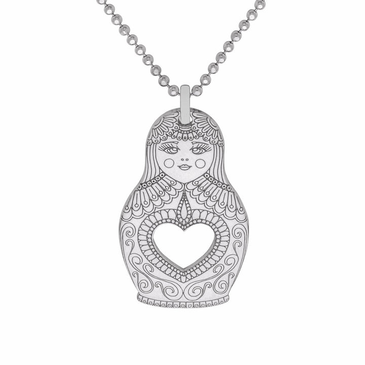This Large Silver Russian Doll Pendant Necklace by Cartergore is a unique and personalized piece from the Tattoo Candy collection. The Russian Doll, a symbol of protection and family, is tailored to your individuality. Its distinctive design and unique edge make it a perfect statement piece to be worn alone or layered with other charms to tell your own story.