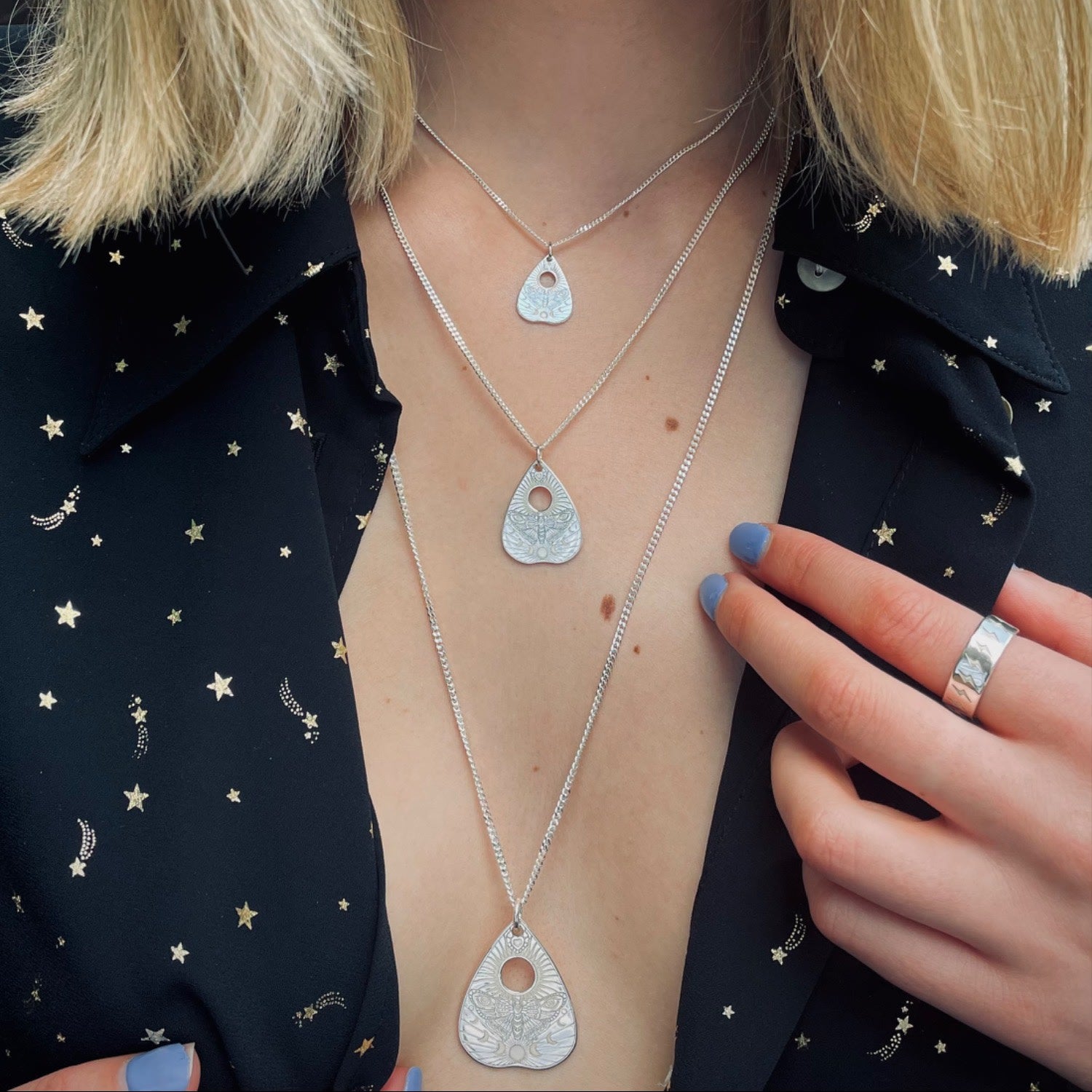 This Large Sterling Silver Moth Planchette by Cartergore is a unique and edgy pendant. From the Tattoo Candy collection, this piece is tailored to your individuality, blending premium bespoke beauty with a unique aesthetic. The moth planchette design is a captivating and symbolic statement, perfect for those who want to tell their own story with their jewelry.