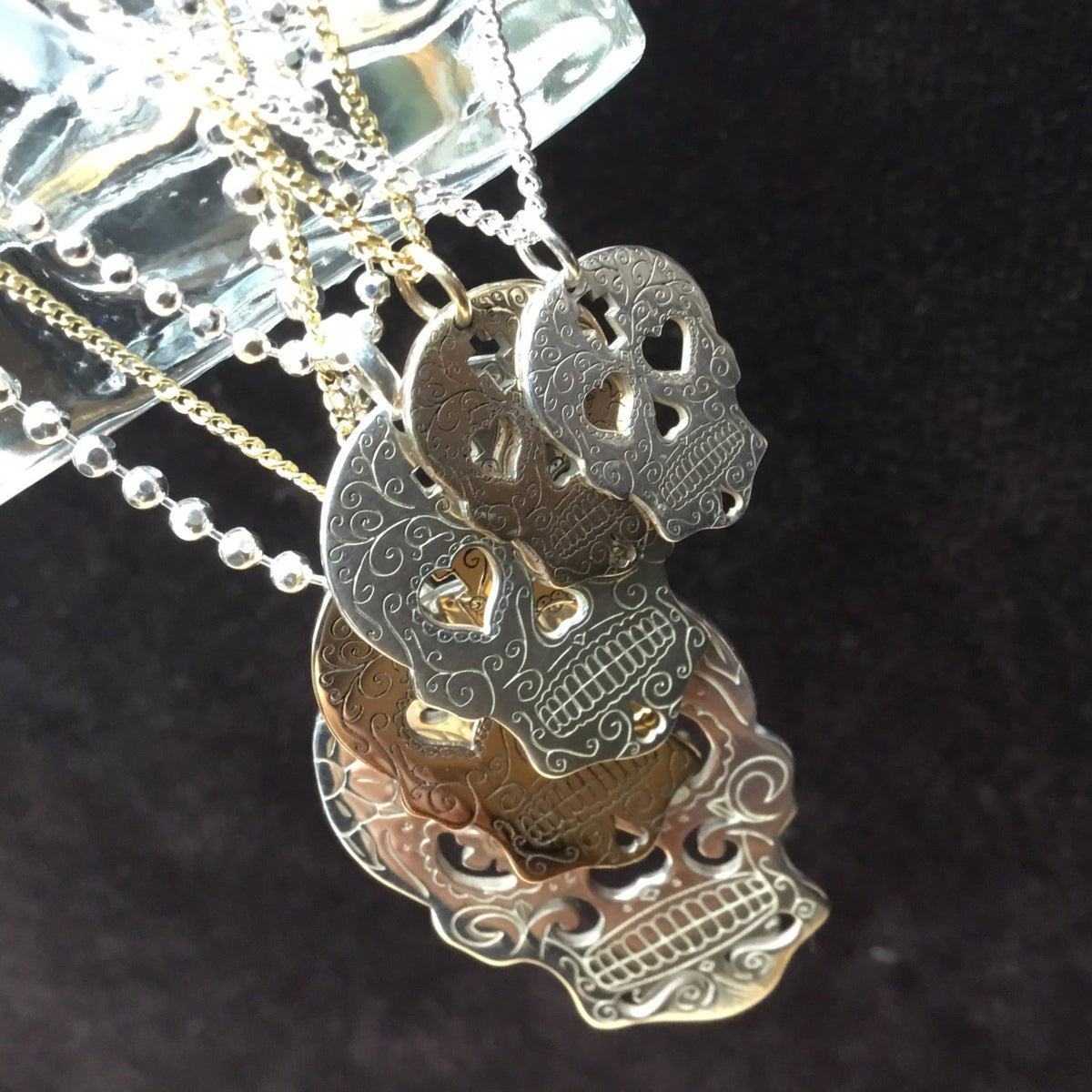 This pendant is a medium-sized sugar skull with heart eyes, crafted from a gold-plated metal.