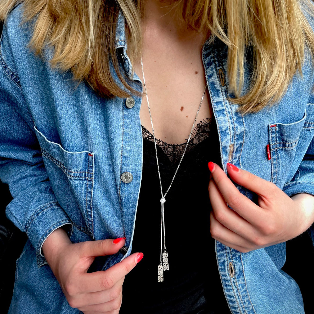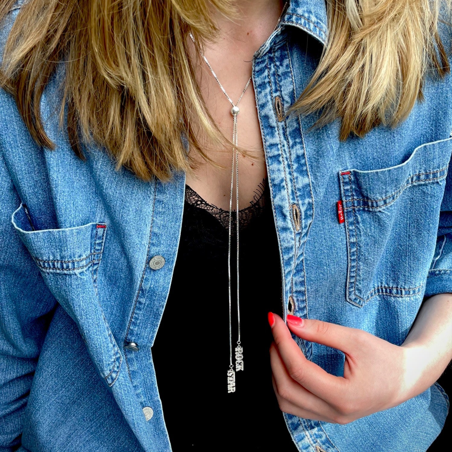 The Rock Star Silver Silver Slider Necklace by Cartergore is part of the Tattoo Candy collection, tailored to express your individuality. This lariat necklace features a unique, edgy design with a hint of traditional tattoo styling. Its bespoke beauty and unique character make it a perfect piece for layering, allowing you to build your own story and showcase your personal style.