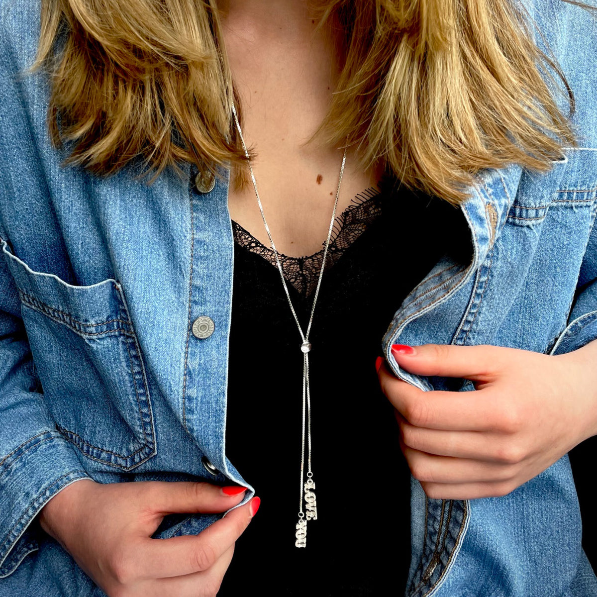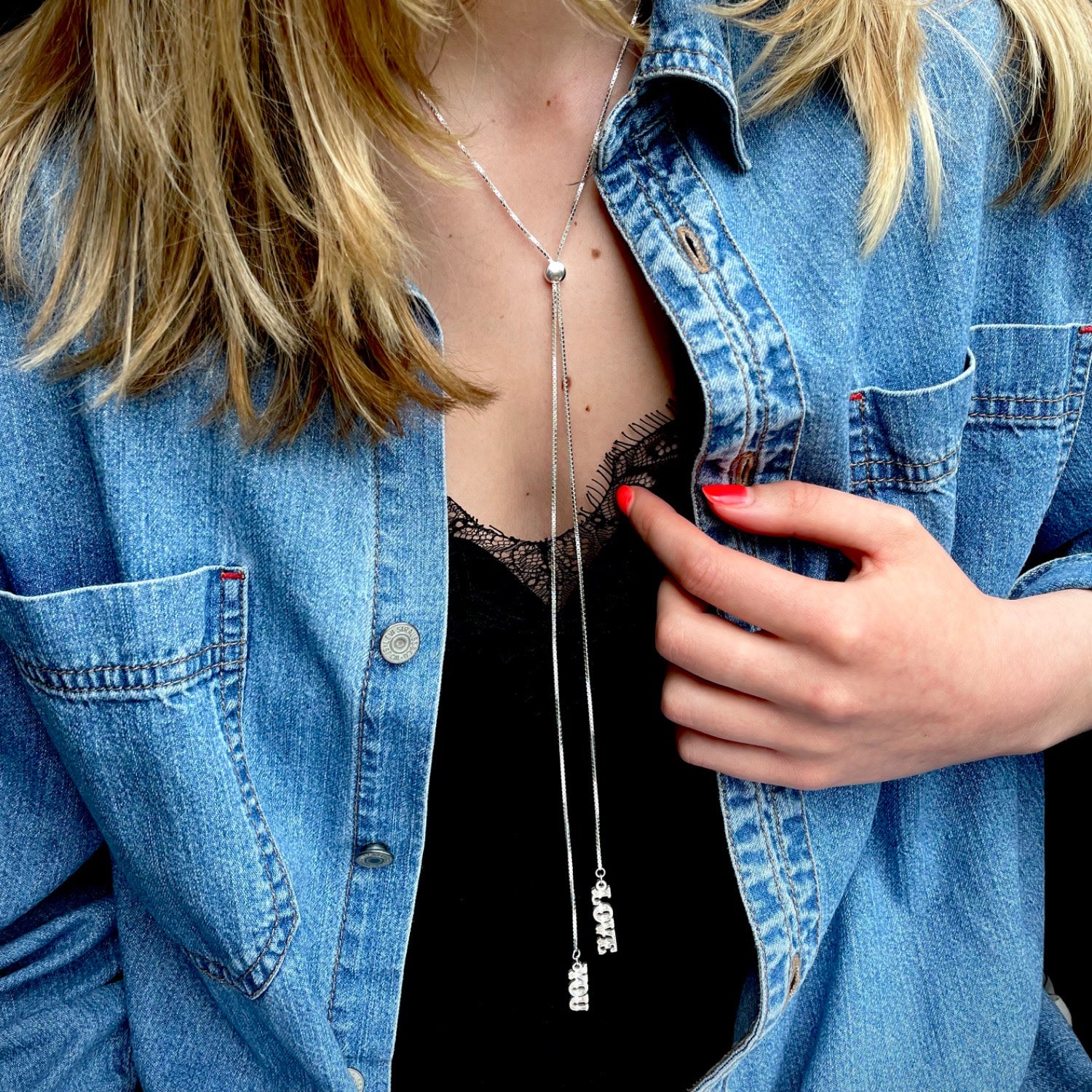 The Love You Sterling Silver Slider Necklace by Cartergore is a unique piece from the Tattoo Candy collection, designed to express your individuality. This lariat-style necklace features a unique "Love You" motif, blending premium bespoke beauty with an edgy, hard-to-define aesthetic. It's a perfect piece for layering to build your own personal story.