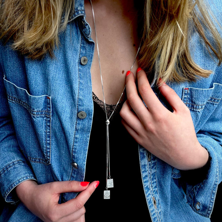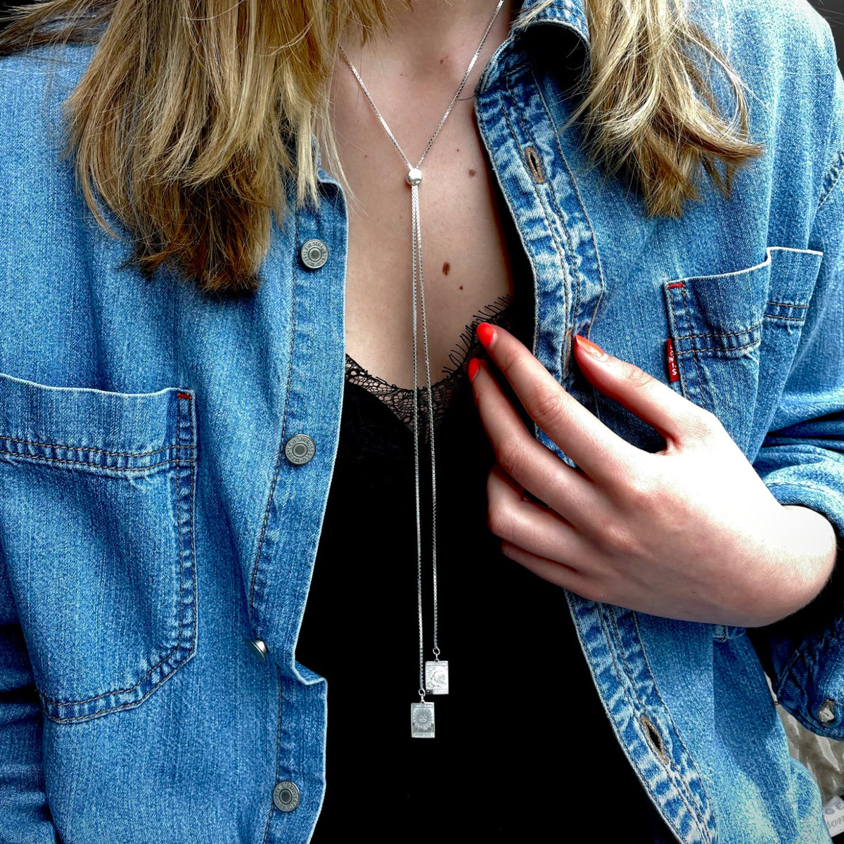 The Tarot Card Sterling Silver Slider Necklace by Cartergore is a unique and spiritual accessory from the Tattoo Candy collection. This lariat-style necklace features a tarot card motif, blending traditional styling with a modern edge. It's perfect for those who want to build their own story and express their individuality through jewelry.