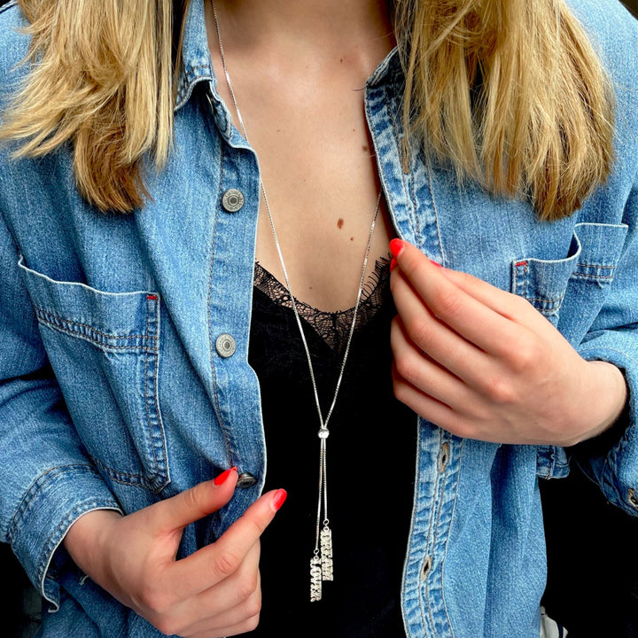 The Dream Lover Sterling Silver Sluder Necklace by Cartergore is a whimsical lariat necklace from the Tattoo Candy collection. This piece features a "Dream Lover" motif, which adds a personal and artistic touch to your style. It's a versatile piece that can be layered to create a look that is uniquely yours.