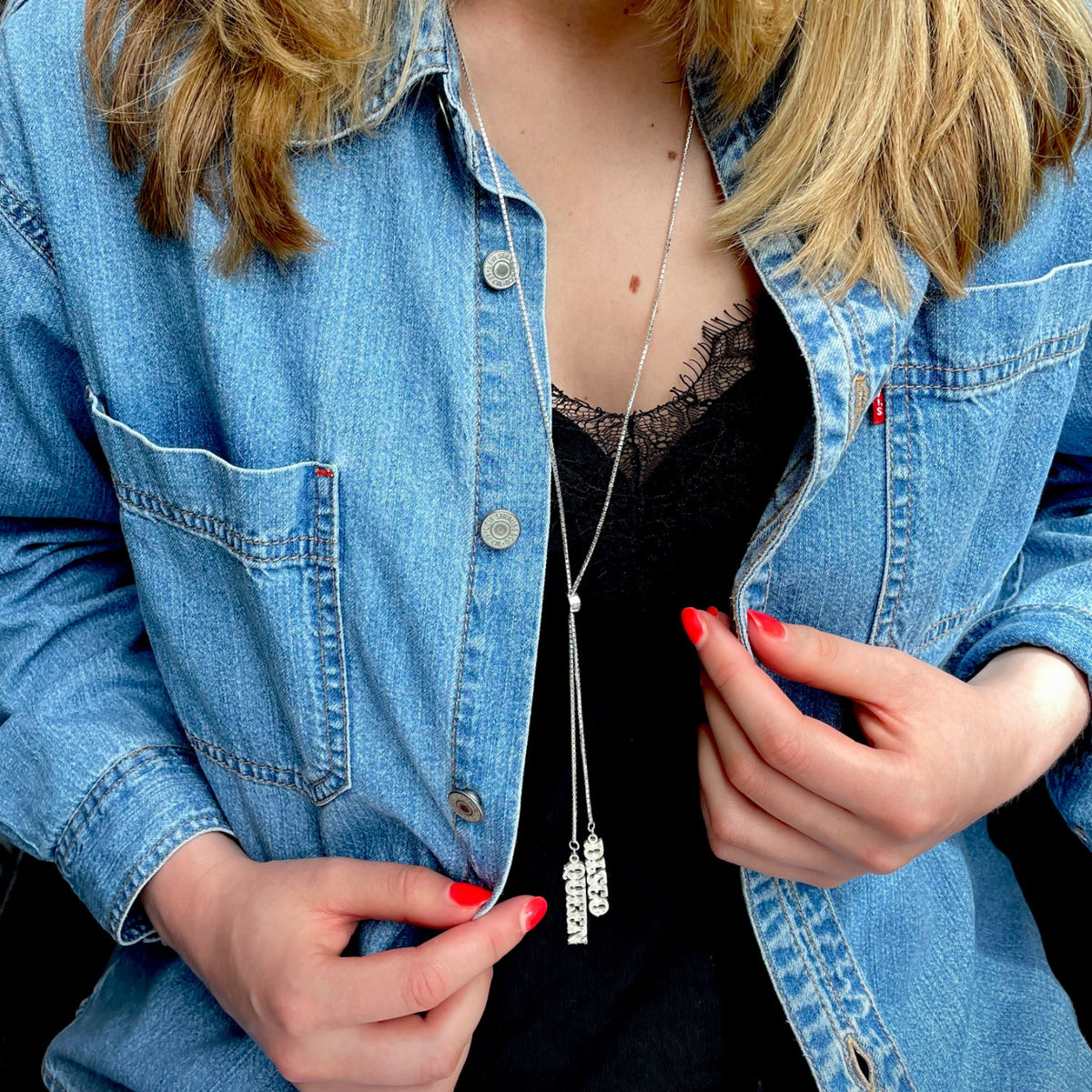 The Disco Queen Sterling Silver Slider Necklace by Cartergore is a bold and fun accessory from the Tattoo Candy collection. This lariat necklace features a "Disco Queen" motif, perfect for those who want to express their unique and vibrant personality. It's designed for layering and creating your own personal style story.