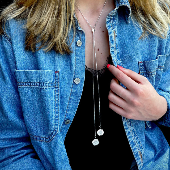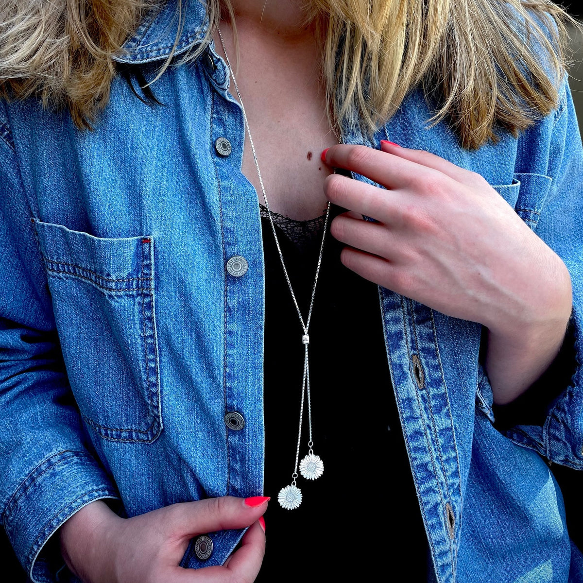 The Daisy Flower Sterling Silver Slider Necklace by Cartergore is a charming accessory from the Tattoo Candy collection. This lariat necklace features a daisy flower motif, blending traditional tattoo styling with a premium, bespoke beauty. It's perfect for layering and building your own story.
