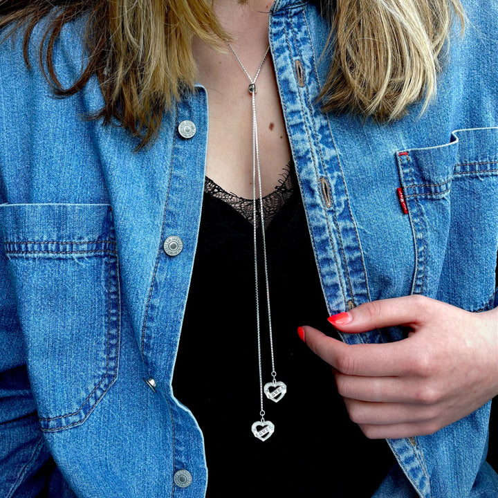 The Sailor Heart Sterling Silver Slider Necklace by Cartergore is a classic and unique lariat necklace from the Tattoo Candy collection. It features a sailor heart motif, which adds a personal and artistic touch to your style. This versatile piece is perfect for mixing, matching, and layering.