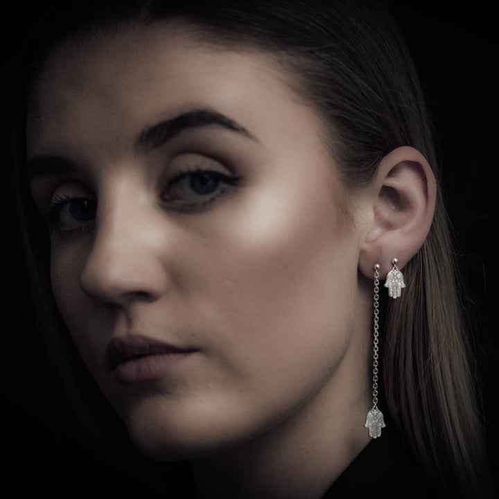 This Gold Hamsa Hand Single Long Drop Earring by Cartergore is a playful and personal piece from the Tattoo Candy collection. This single earring, with its hamsa hand motif, is tailored to your individuality and designed to be mixed and matched. Its unique edge allows you to build your own story, adding a touch of bespoke beauty and spiritual symbolism to your style.