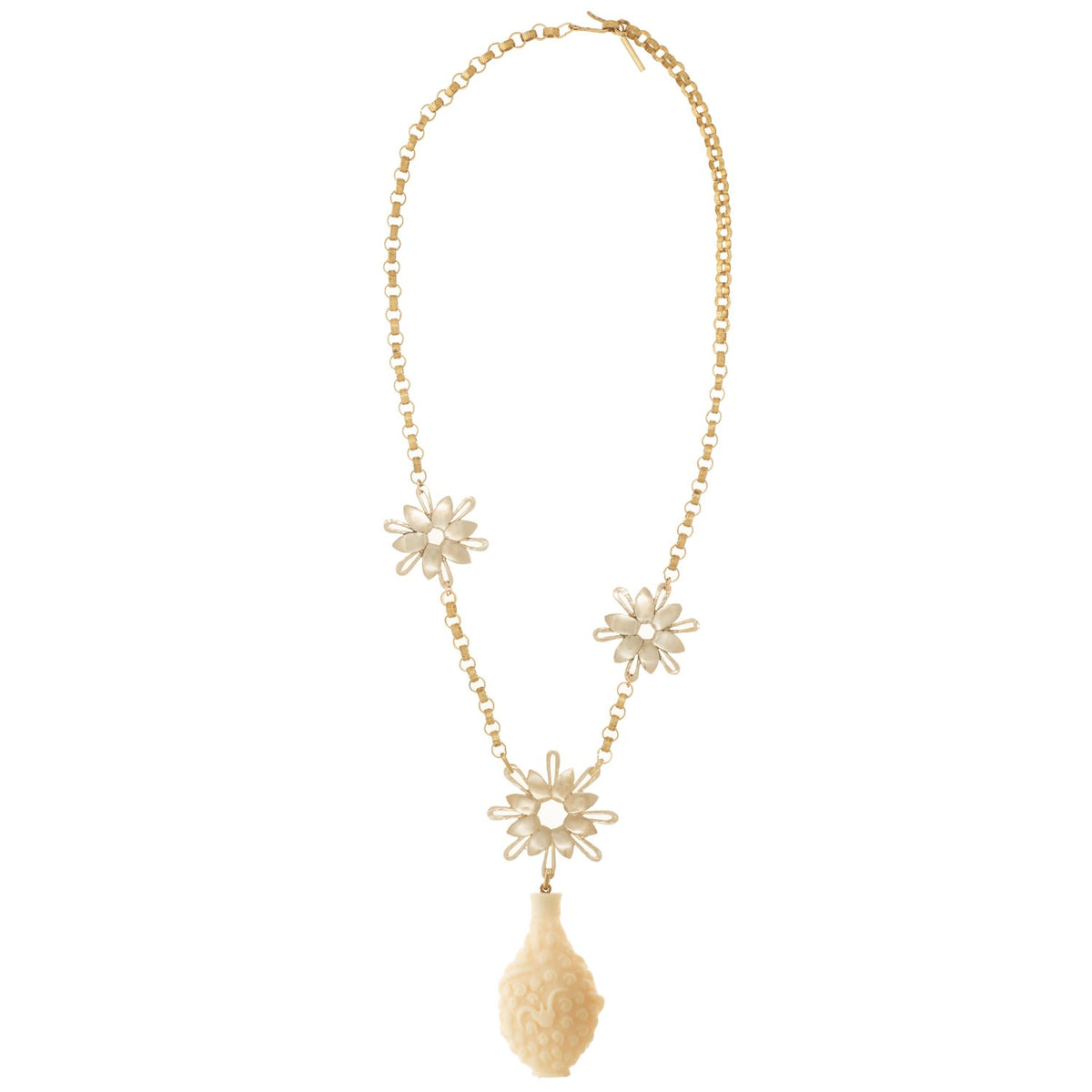 This necklace is handmade from certified 100% recycled brass and upcycled/vintage materials. It features a vintage resin vase pendant and a vintage brass chain. The flowers are handcrafted from brass.