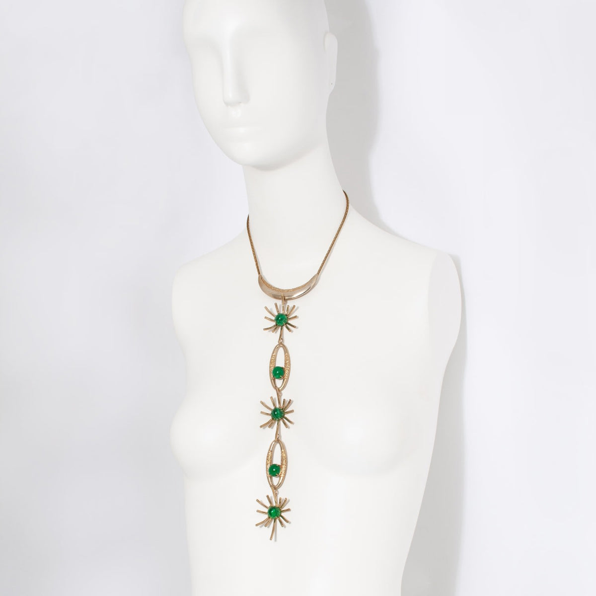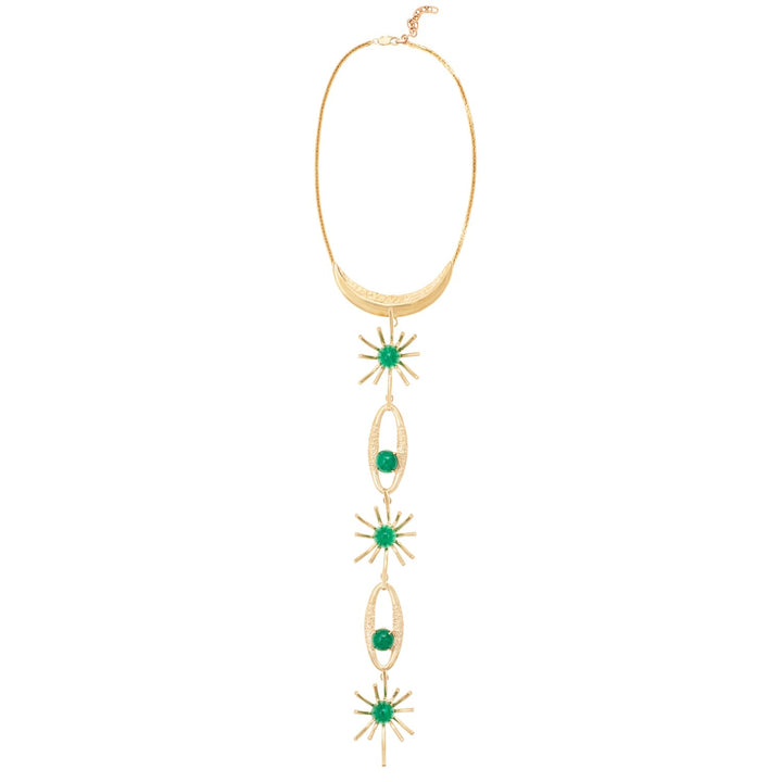 This Angelica Necklace by Castlecliff is a bold and striking piece guaranteed to outshine the rest. Inspired by the glamour of cocktail hour, the necklace features a plunging design with brass starbursts punctuated by vintage glass stones. Each piece is handmade and finished in NYC, with slight variations that make it a unique piece of wearable art.