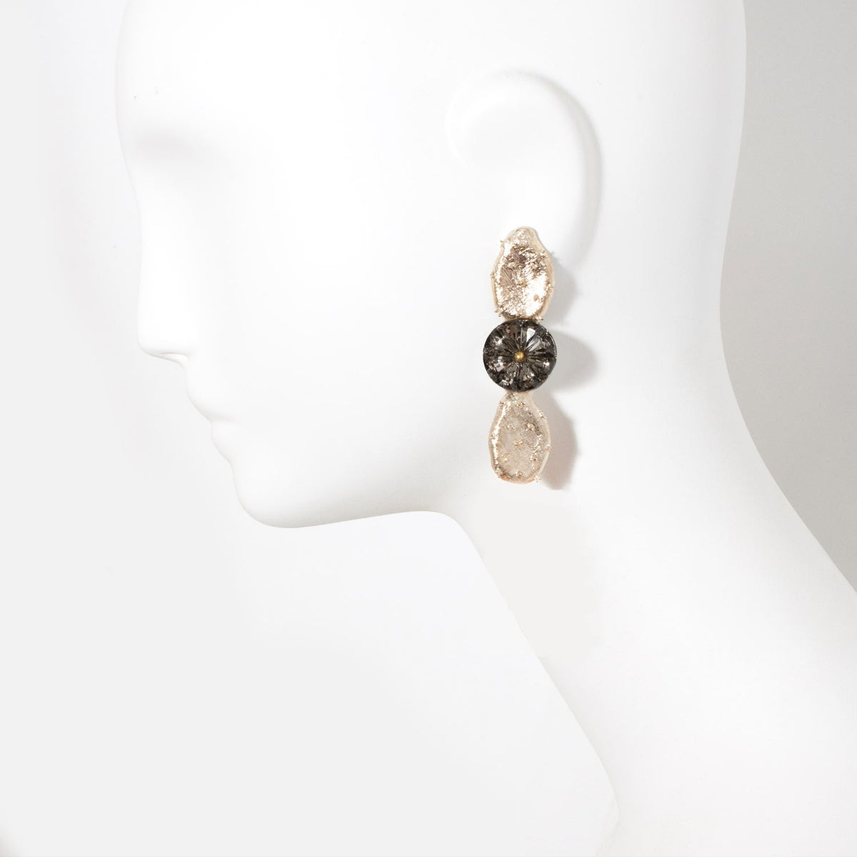 The Opuntia Earring Petite by Castlecliff is a unique and thoroughly modern earring with a vintage feel. It suspends a single vintage pressed glass flower between handcrafted brass prickly pears. The earring is inspired by a 1960s cactus brooch, creating a beautiful blend of old and new elements. This is a special, one-of-a-kind accessory exclusively handcrafted in NYC.