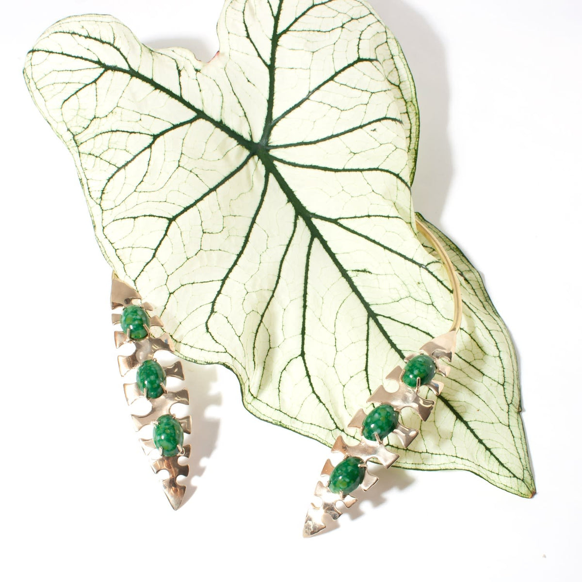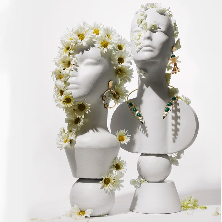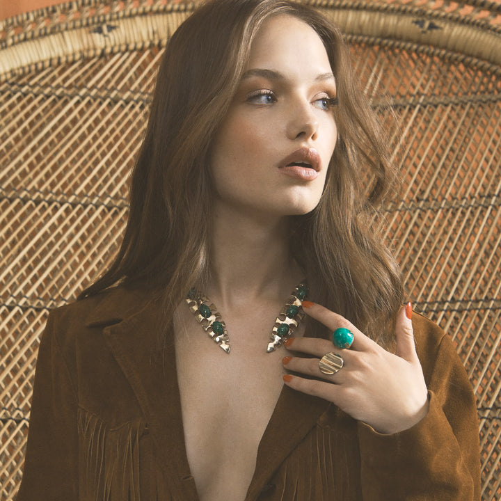 The Palm Collar by Castlecliff is a bold, sculptural piece that gracefully wraps around the collarbone. It features two adorned brass leaves and is handcrafted by artisans in NYC. The raw brass will achieve a rich patina over time, giving each piece a unique and personal character.