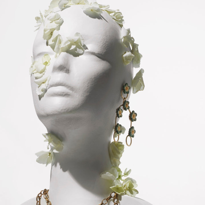 The Floral Highland Earring by Castlecliff is a statement-making piece handcrafted from recycled brass. It features hand-painted vintage ceramic blooms, giving it a unique, artisanal feel. The design is a bold and colorful update to a bestselling style. Each piece is unique due to the handmade process, and the earring is finished with a sterling silver post for comfort.