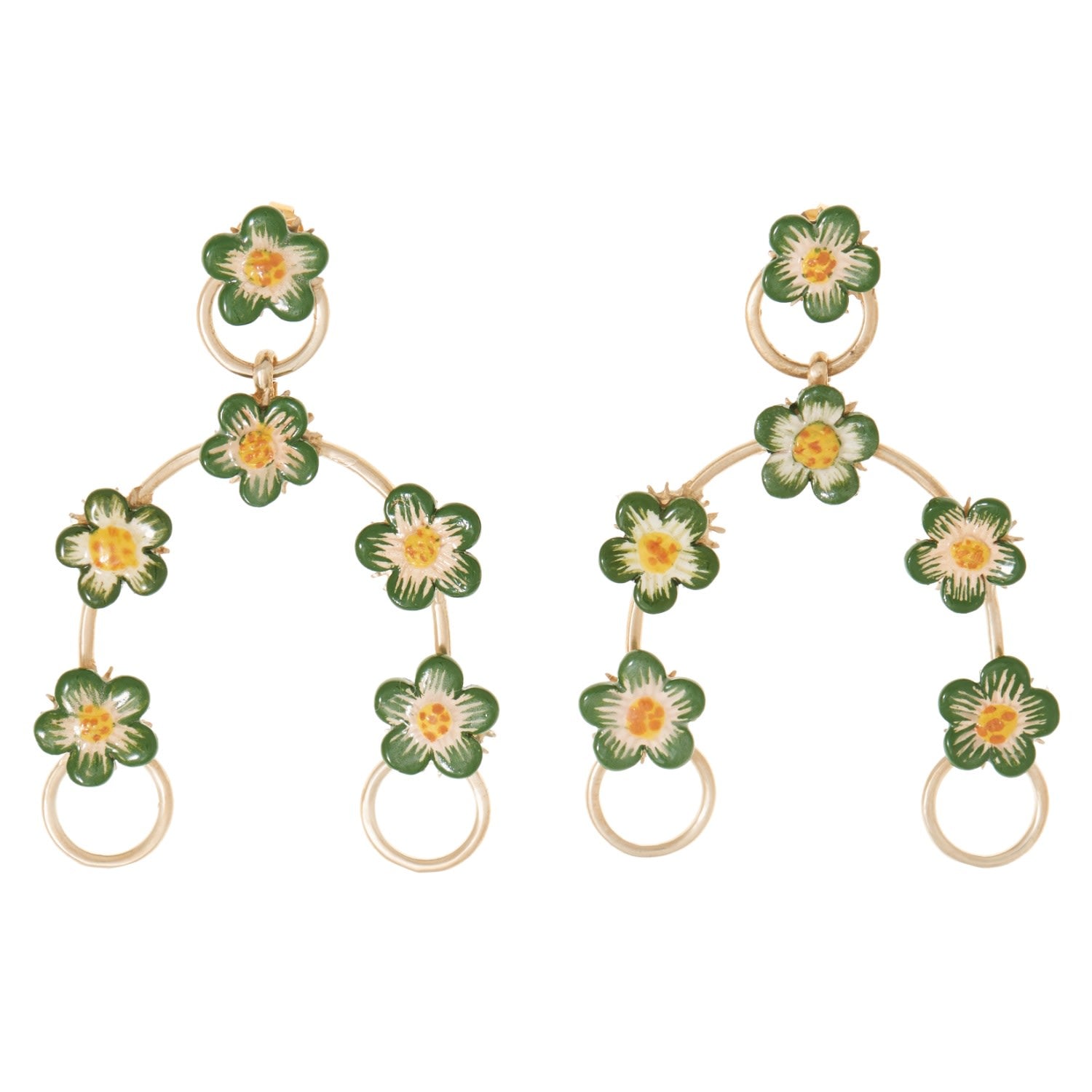 These earrings are handcrafted from certified 100% recycled brass and feature ceramic hand-painted vintage blooms. They have sterling silver posts.