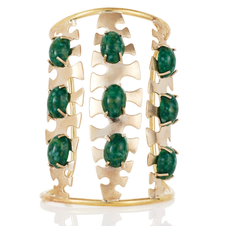 This cuff is handcrafted from 100% certified recycled brass and adorned with upcycled vintage glass stones.