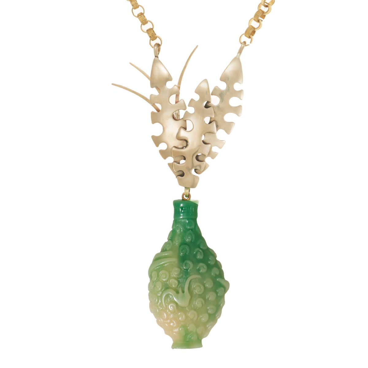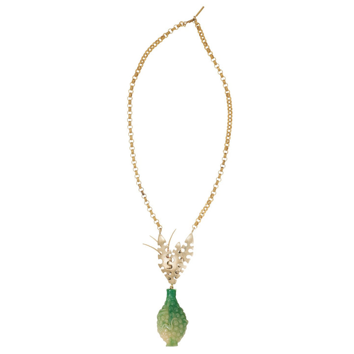This pendant necklace is handcrafted from certified 100% recycled brass and features a vintage resin vessel from the 1950s.