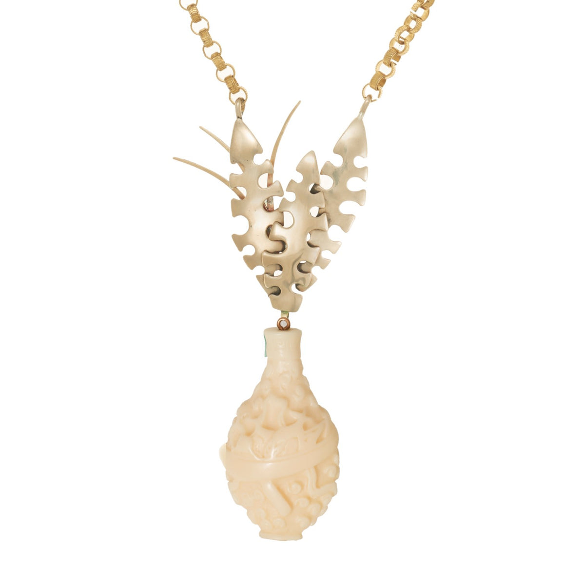 This Vase Necklace In Fresh Cut Green by Castlecliff is a quirky and unique piece that adds a vintage touch to any outfit. It features a vintage resin vessel charm from the 1950s with a unique color pattern, from which brass palm fronds branch out. The necklace is handmade and finished in NYC, and each piece is a testament to the hands that created it.