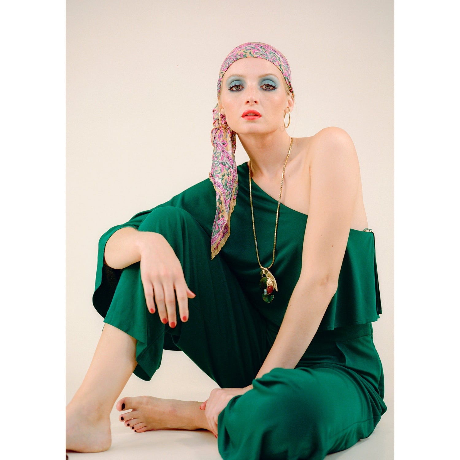 This Soleri Pendant In Pine & Midnight by Castlecliff is a unique, hinged brass pendant inspired by the architecture of Paolo Soleri. It features three hand-set vintage glass cabochons in a beautiful pine and midnight color combination. Handcrafted in NYC using 100% recycled brass and upcycled materials, this artistic piece is a perfect blend of modern and vintage elements.
