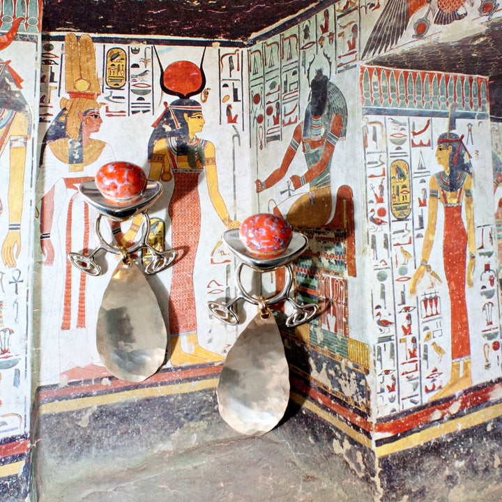 The Aida Earring In Pine by Castlecliff is a luxurious statement piece inspired by Egyptian Revival. It features a hand-hammered brass teardrop akin to an ancient artifact, adorned with vintage glass stones. Crafted from 100% recycled brass and up-cycled materials, this dangle earring is a striking example of modern artistry and sustainability.