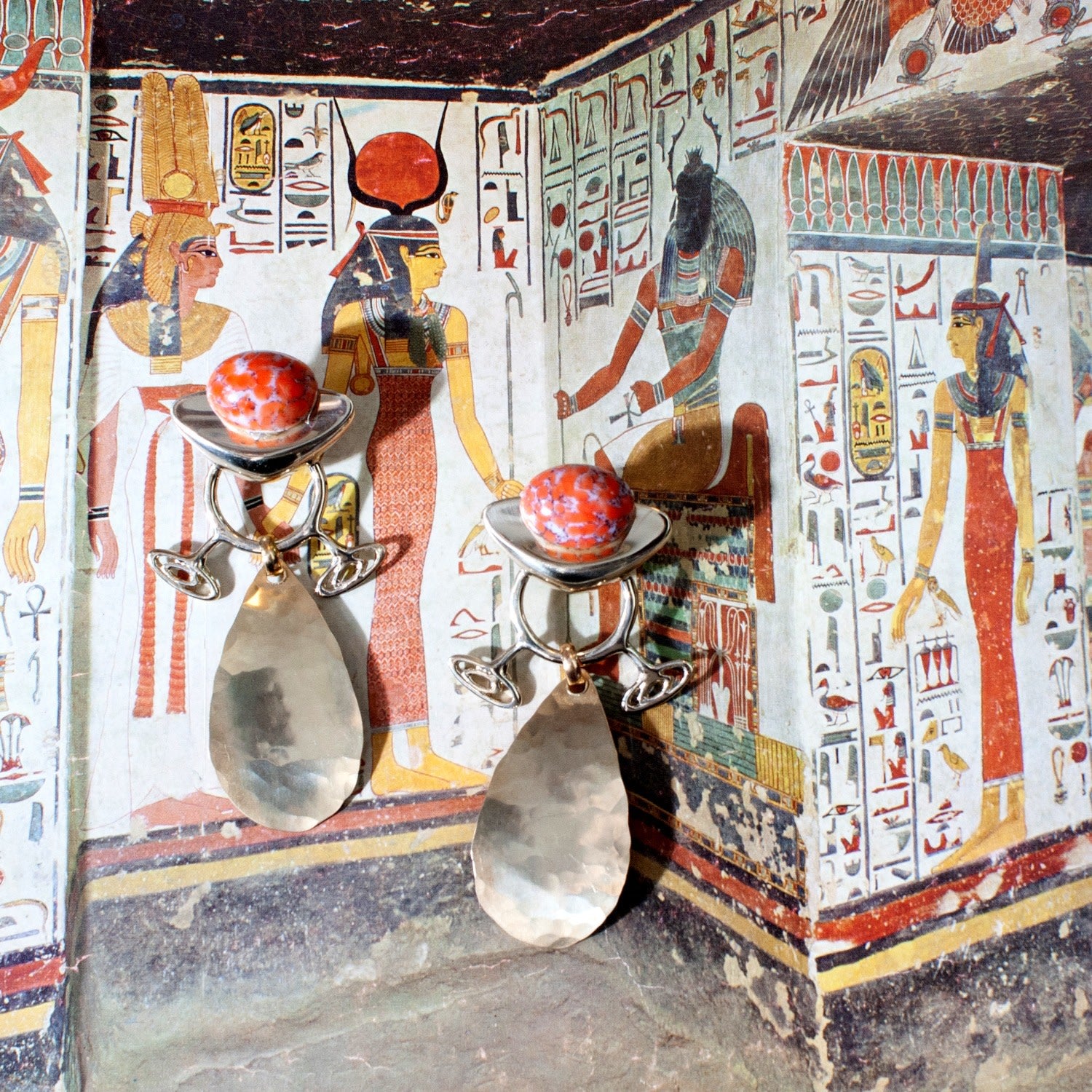 The Aida Earring In Coral by Castlecliff is a luxurious statement piece inspired by Egyptian Revival. It features a hand-hammered brass teardrop akin to an ancient artifact, adorned with vintage glass stones. Crafted from 100% recycled brass and up-cycled materials, this dangle earring is a striking example of modern artistry and sustainability.