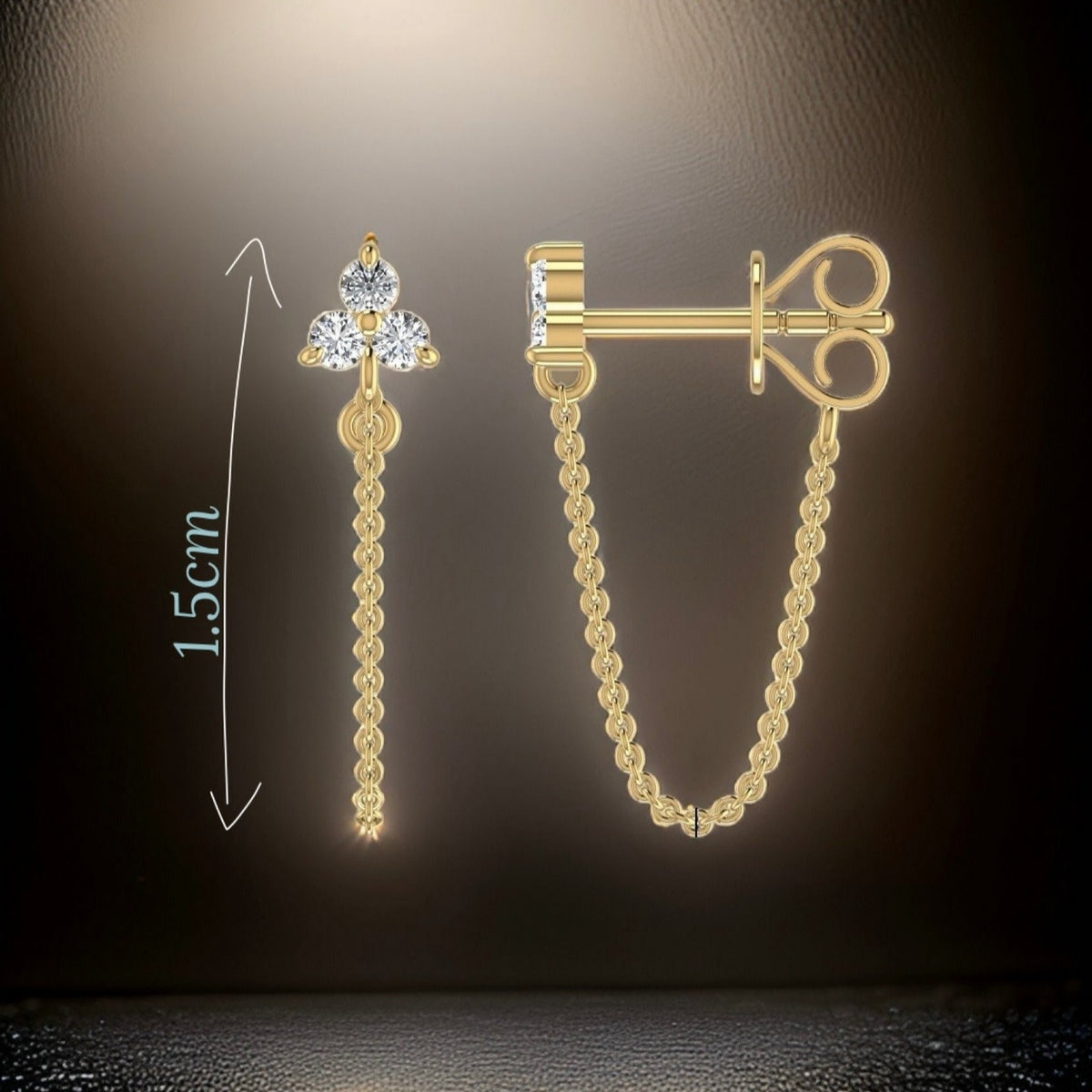 These earrings are crafted from 750 (18k) gold and feature approximately 0.25 carats of natural F/G VS diamonds combined. The chain with the wrap-around drop measures 1.5cm.