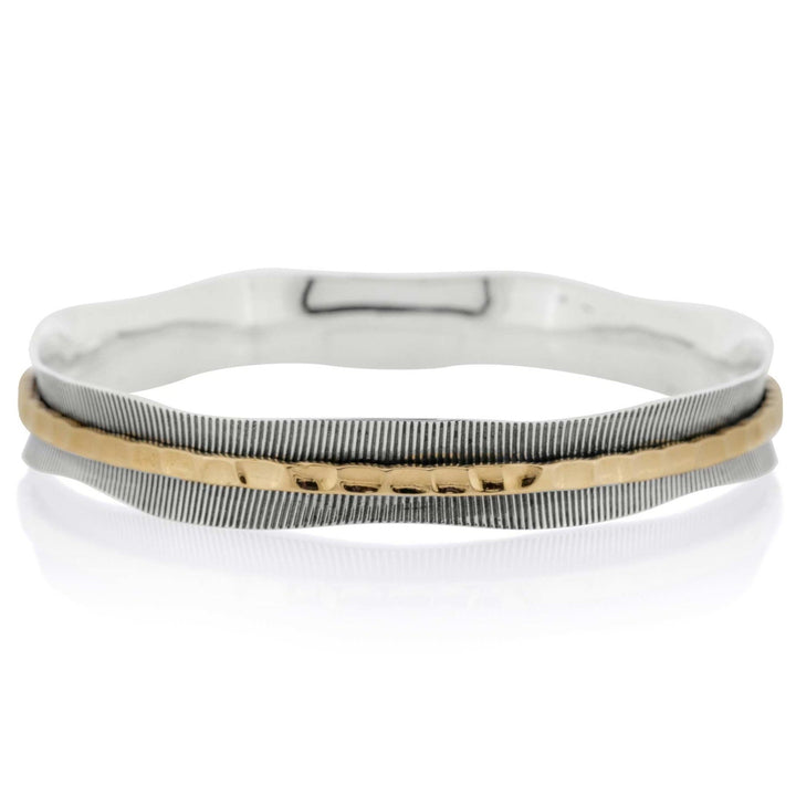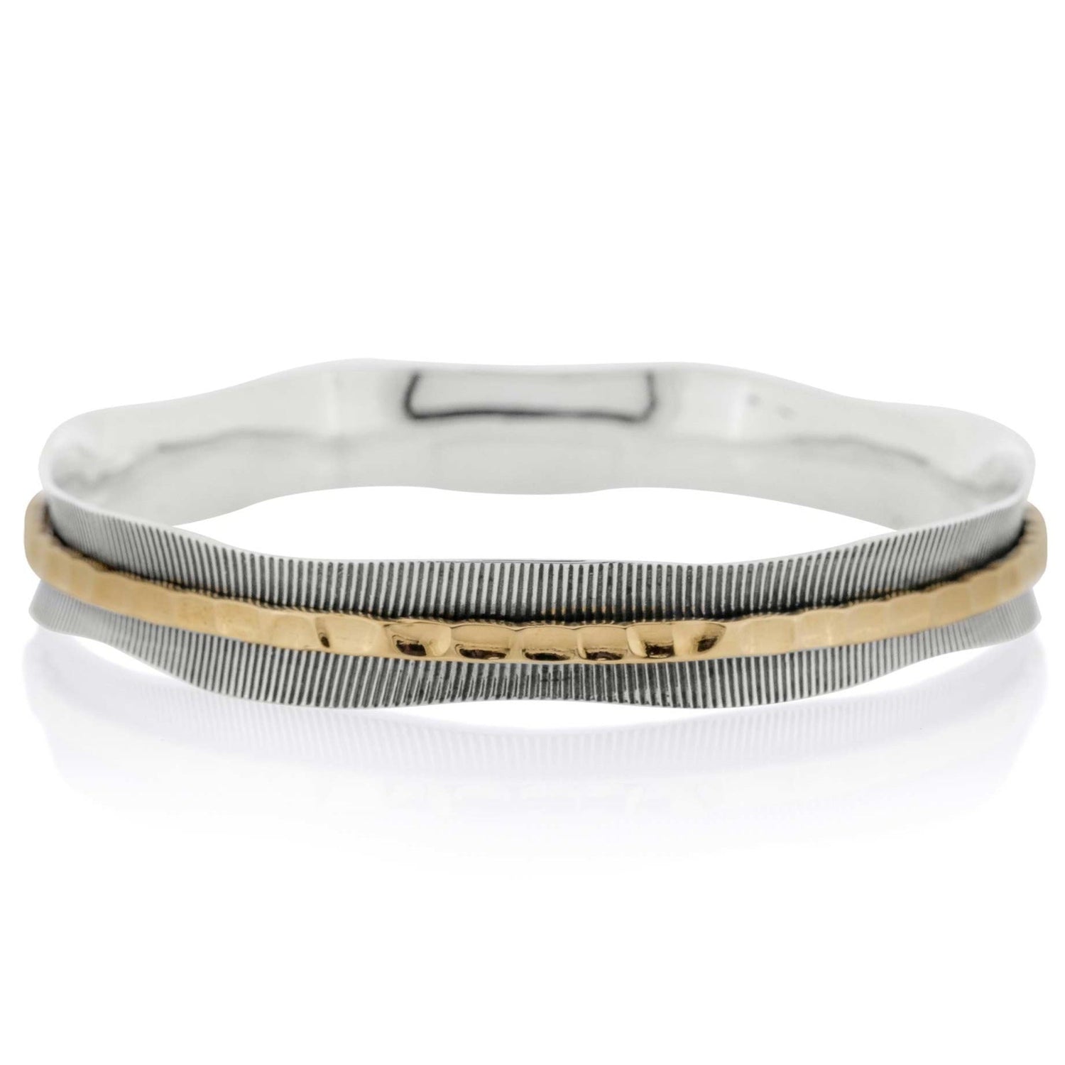The Let It Flow Silver Spinning Bangle by Charlotte's Web Jewellery is a meaningful and therapeutic piece designed to help with anxiety. It features two handcrafted bands—one silver and one brass—that can be spun to calm the mind and soul. This bangle is made from sterling silver and brass.