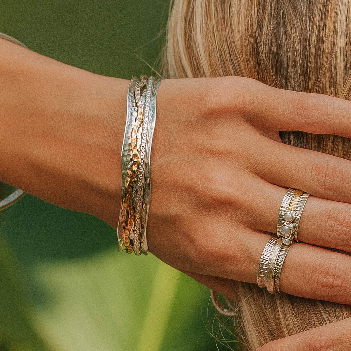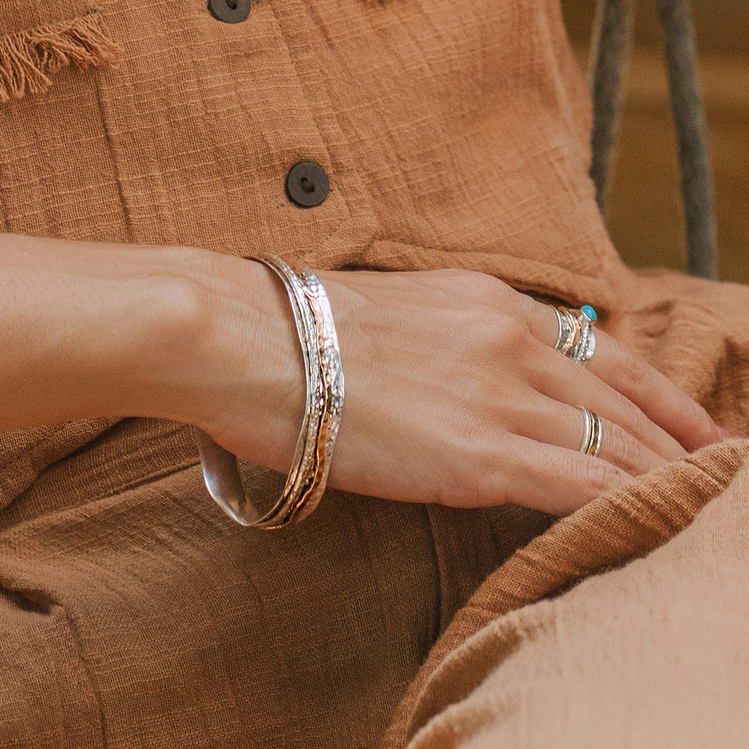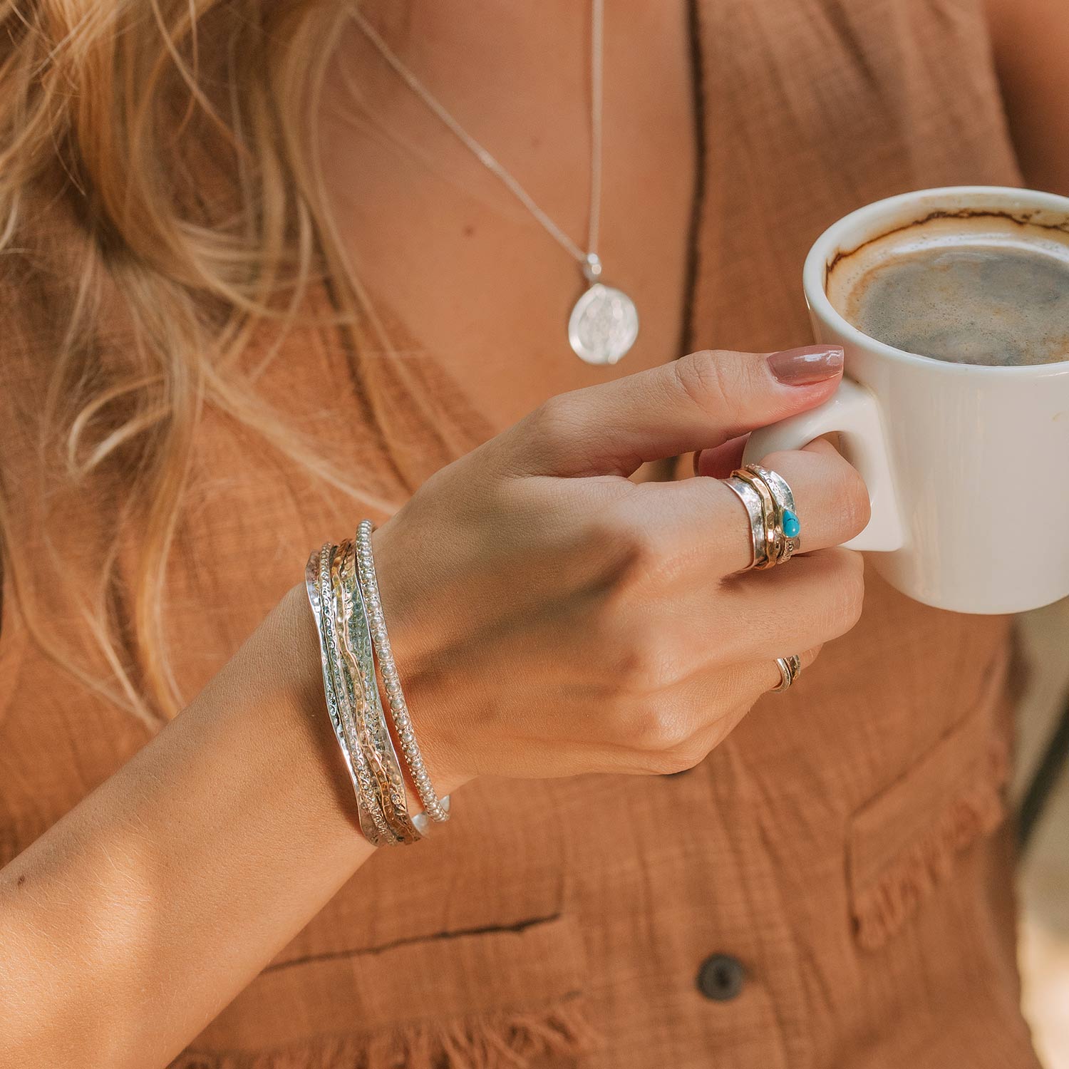 The Aura Magic Silver Spinning Bangle is an enchanting and tactile piece. Inspired by ancient Tibetan prayer wheels, the bangle features a spinning element that can help soothe the mind in stressful situations. Handmade and ethically sourced, this bangle is both a beautiful accessory and a tool for mindfulness.