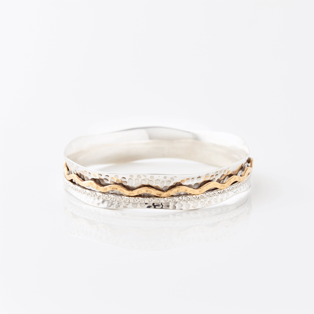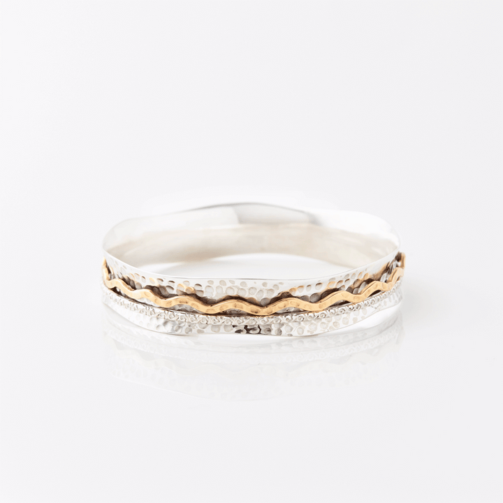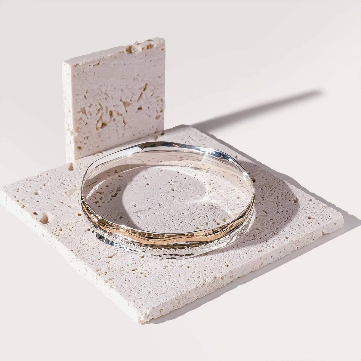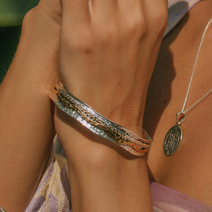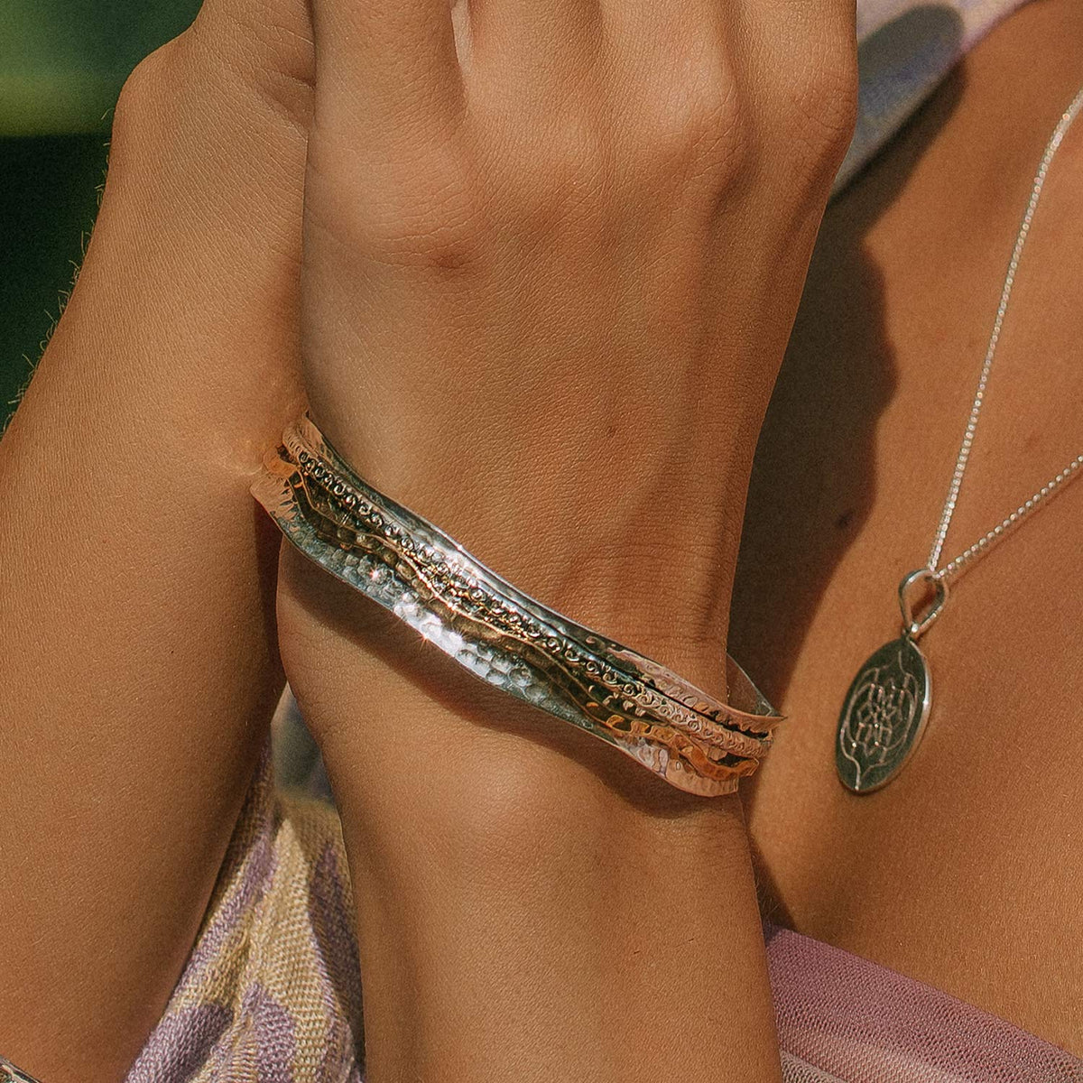 The Aura Magic Silver Spinning Bangle is an enchanting and tactile piece. Inspired by ancient Tibetan prayer wheels, the bangle features a spinning element that can help soothe the mind in stressful situations. Handmade and ethically sourced, this bangle is both a beautiful accessory and a tool for mindfulness.