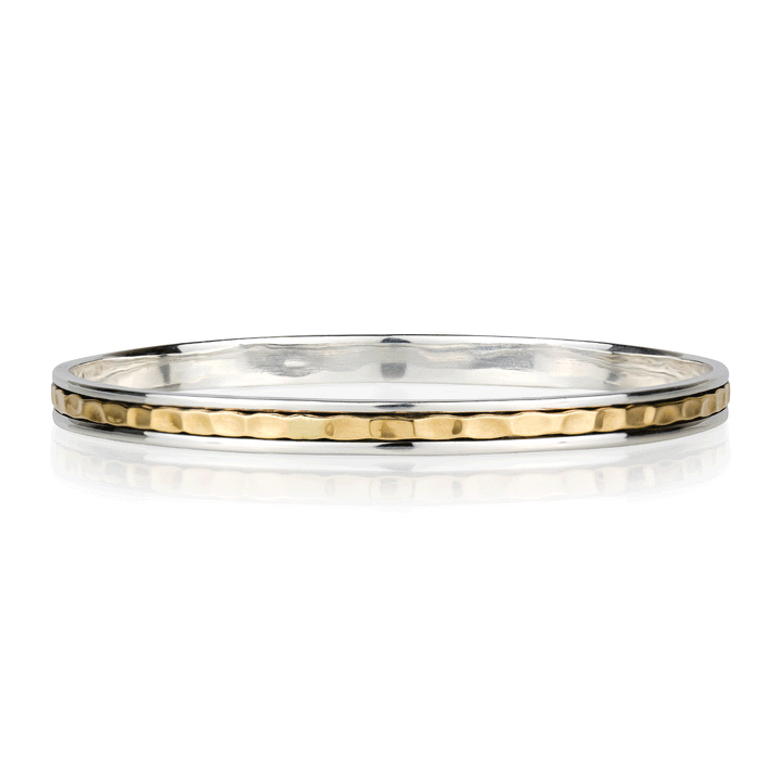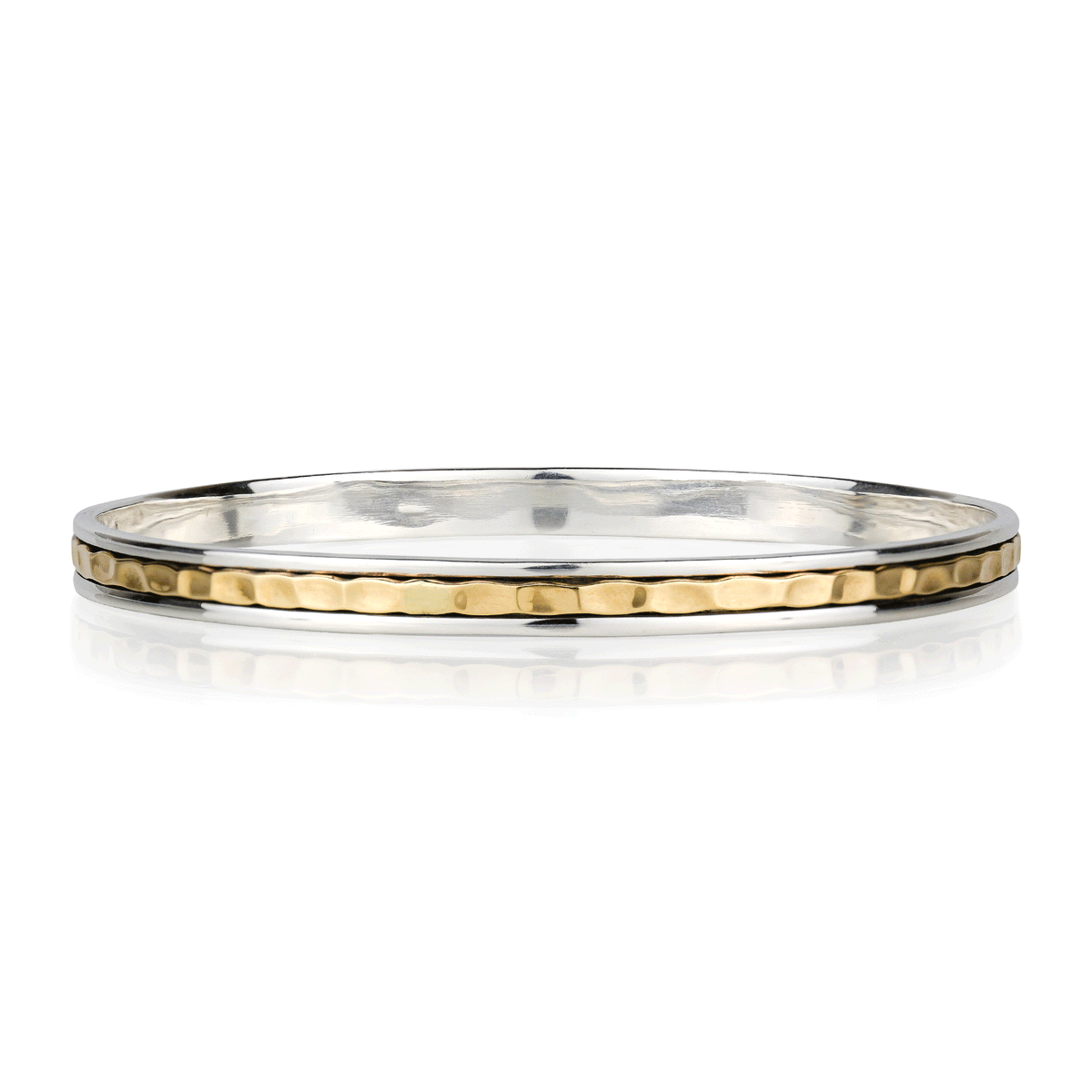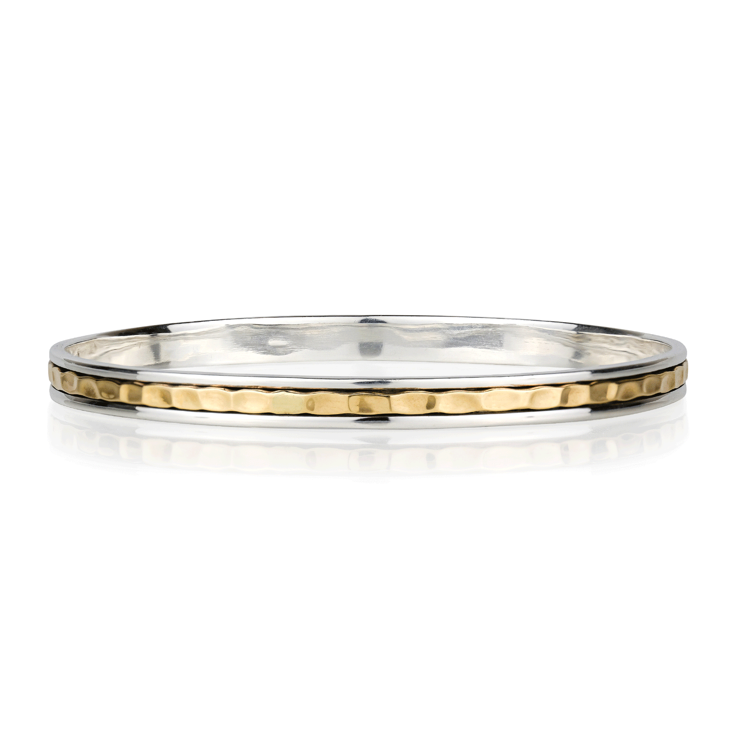 This bangle is handmade from sterling silver, brass, bronze, and mixed metals.