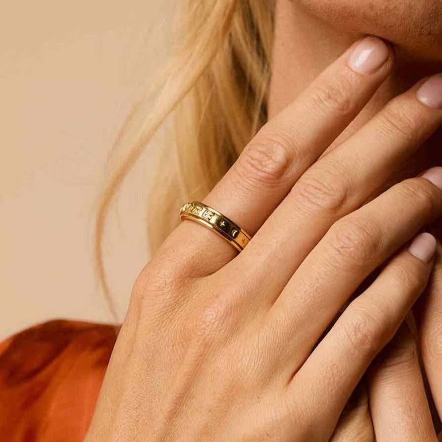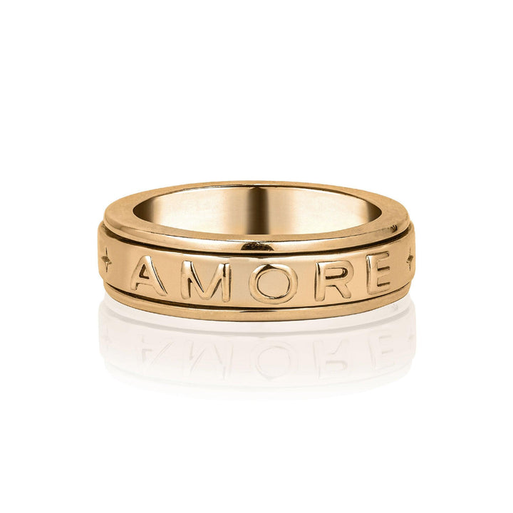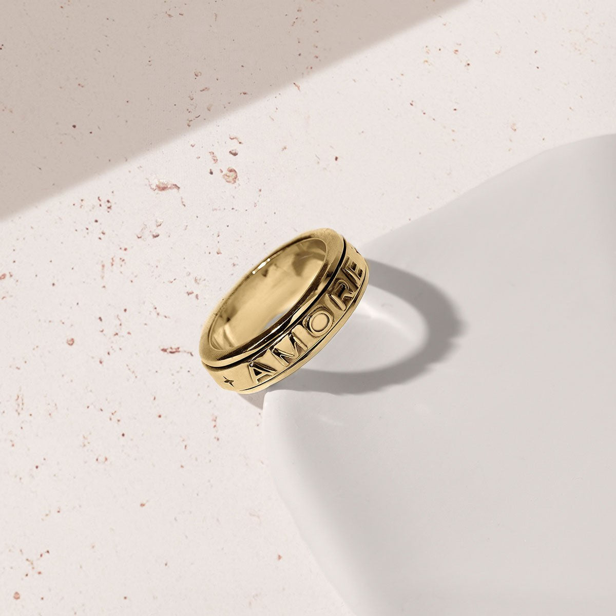 The Amore Gold Vermeil Spinning Ring by Charlotte's Web Jewellery is a celestial-inspired treasure that celebrates love. This handcrafted ring features the word "Amore" and intricate star and moon accents. Made with sterling silver and gold vermeil, this piece embodies the harmony of the cosmos and is a meaningful symbol of self-love and connection.