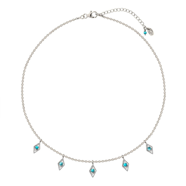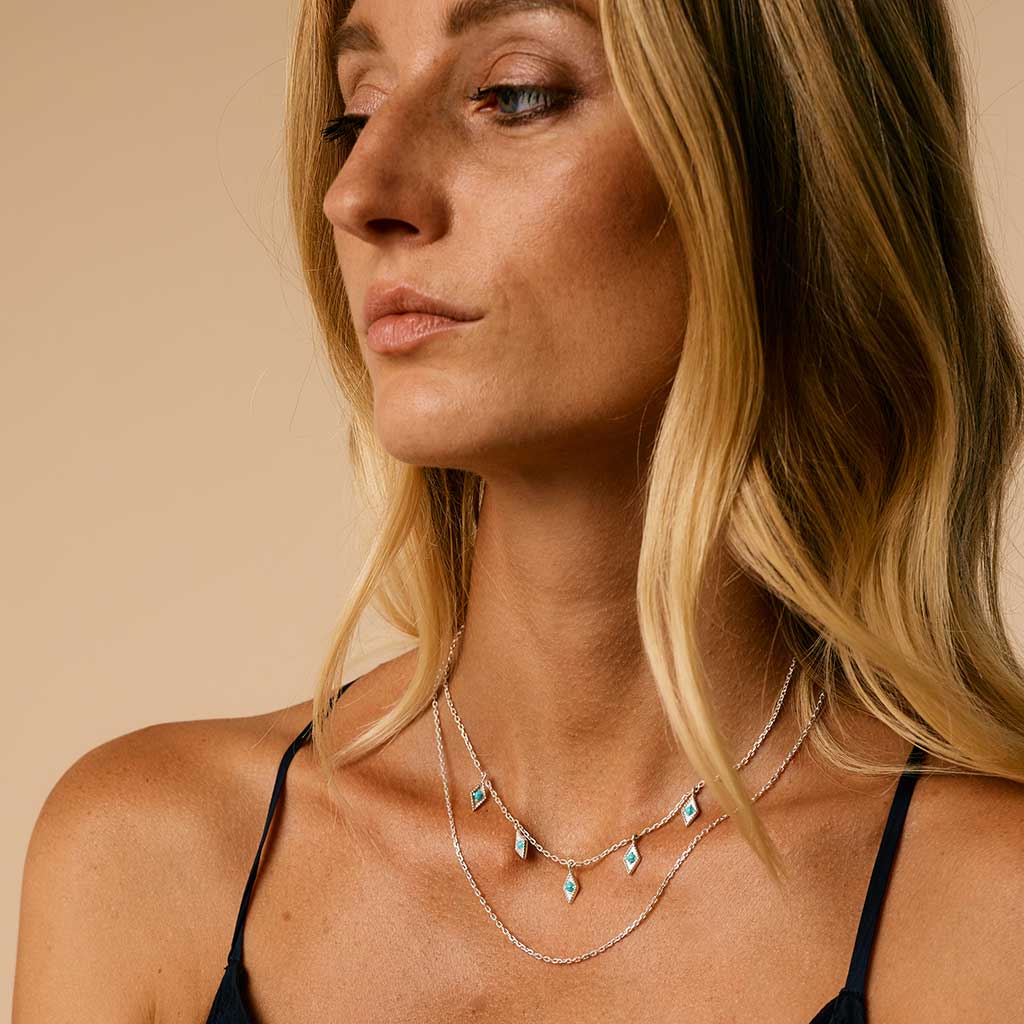 The Medina Silver Charm Necklace by Charlotte's Web Jewellery is an elegant and eye-catching piece influenced by the climates of Morocco, Mexico, and Ibiza. It features a delicate sustainable silver chain and stunning turquoise accents on a Moorish-style charm. This necklace is handcrafted with care.
