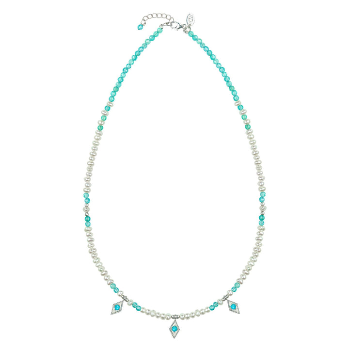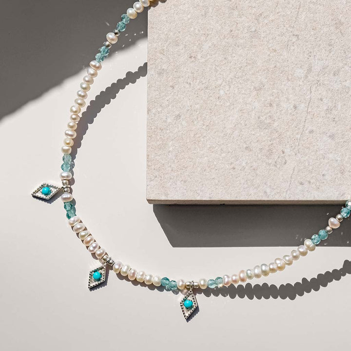 This necklace is handmade from sterling silver and features a beaded chain of genuine pearls and faceted apatite gemstones. It also includes silver charms with turquoise stones.