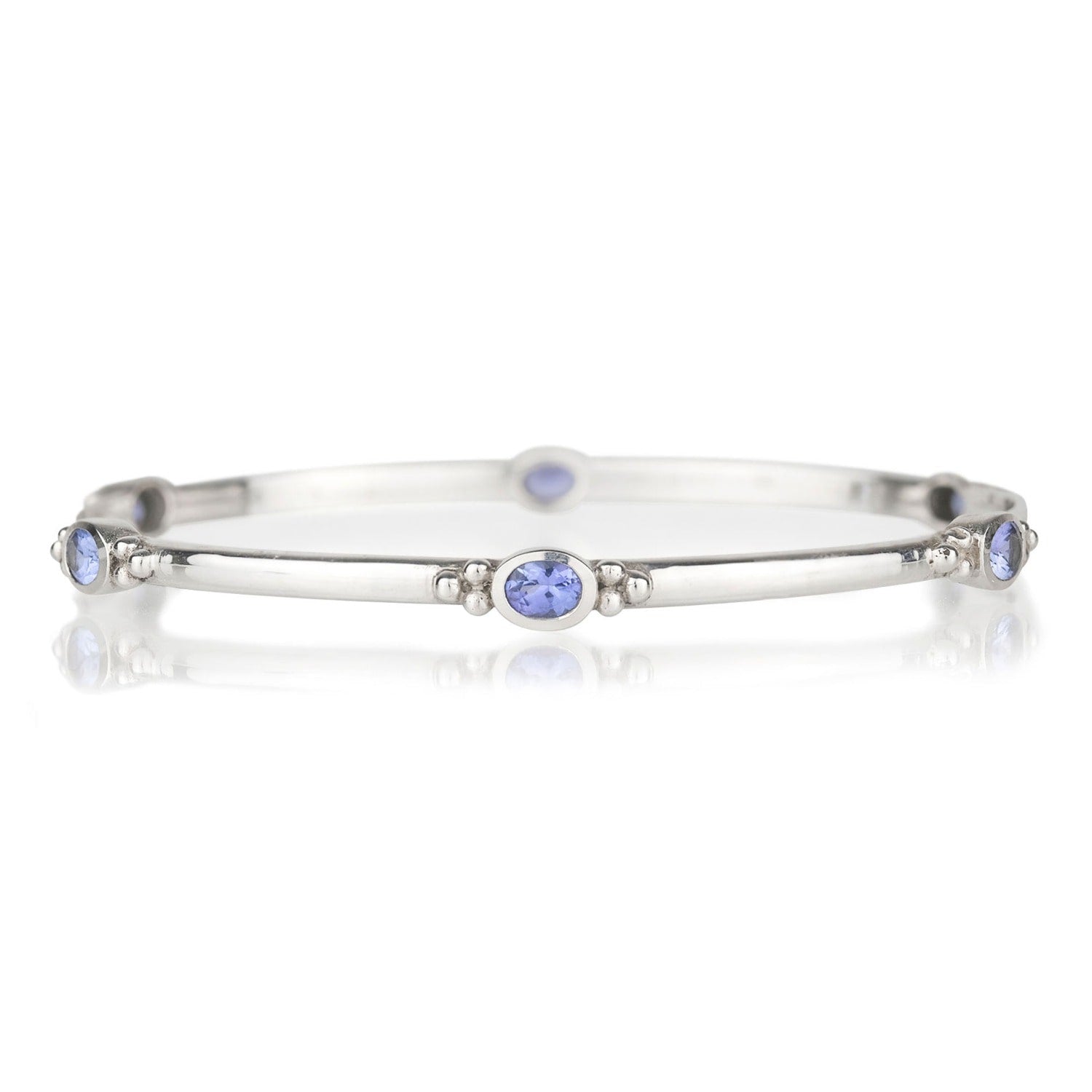 This handmade bangle is crafted from recycled sterling silver and features faceted tanzanite stones (0.6cm x 0.4cm). All stones are genuine.