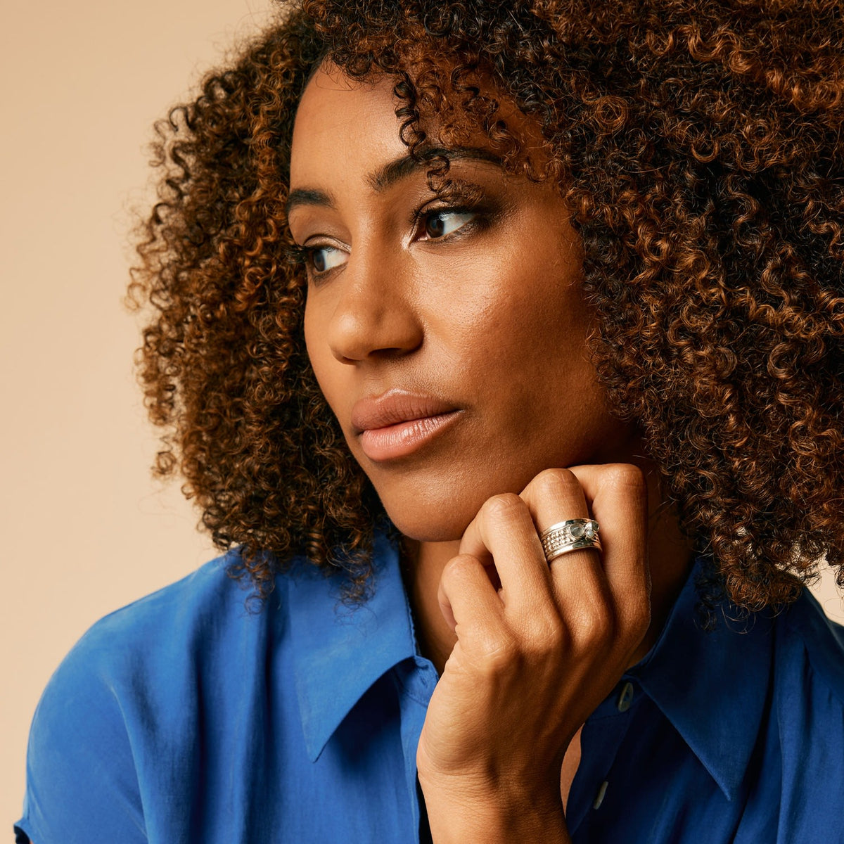 The Ethereal Galaxy Silver Spinning Ring & Bangle Gift Set by Charlotte's Web Jewellery is a celestial-inspired set that sparkles with sustainable silver and ethically sourced gemstones. It features a spinning ring and bangle with white topaz, labradorite, and freshwater pearls. This beautifully handcrafted set is a perfect eco-friendly gift, embodying the magic of the night sky and a commitment to fair trade.
