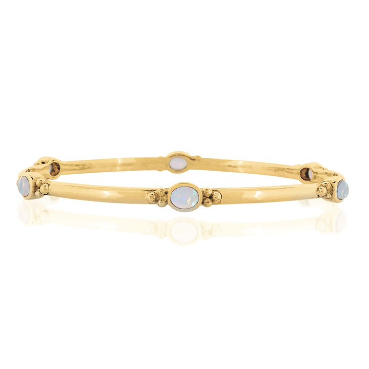 This handmade bangle is gold-plated on recycled brass and features genuine cabochon opals. All stones are genuine and colors may vary.
