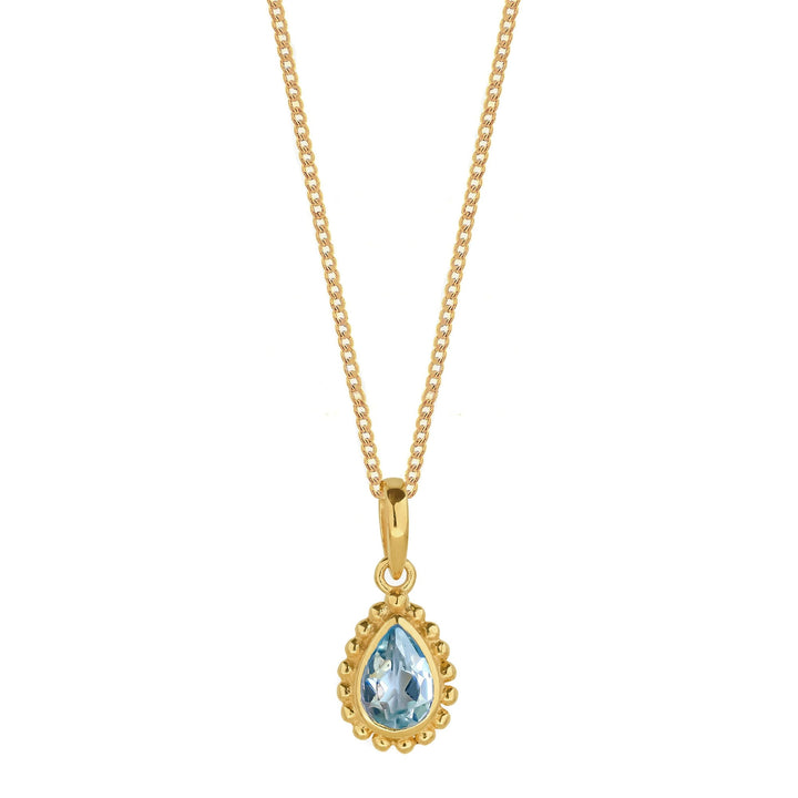 The November Birthstone Gold Necklace by Charlotte's Web Jewellery is a luminous and elegant piece. This necklace features a cool and clear blue topaz, the November birthstone, in a rich gold Rawa setting. Blue topaz symbolizes calm, truth, and communication, making this necklace a perfect blend of classic and contemporary birthstone jewelry.