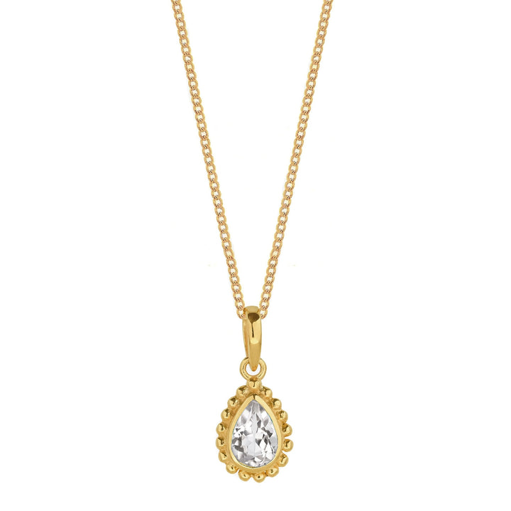 The April Birthstone Gold Necklace by Charlotte's Web Jewellery is elegant and full of light. It features a sparkling white topaz, April's birthstone, which is known for clarity and healing energy. The warm gold Rawa setting gives the necklace a sophisticated and golden twist on traditional birthstone jewelry.