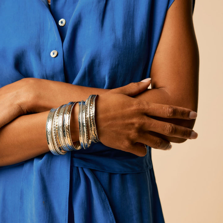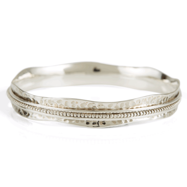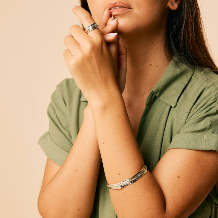 The Aura Halo Silver Spinning Bangle by Charlotte's Web Jewellery is an ethical and sustainable piece with a multi-band design. Inspired by ancient meditation techniques, spinning this bangle is a modern wonder that can soothe the mind and instill a sense of well-being, making it a beautifully tactile and calming accessory.