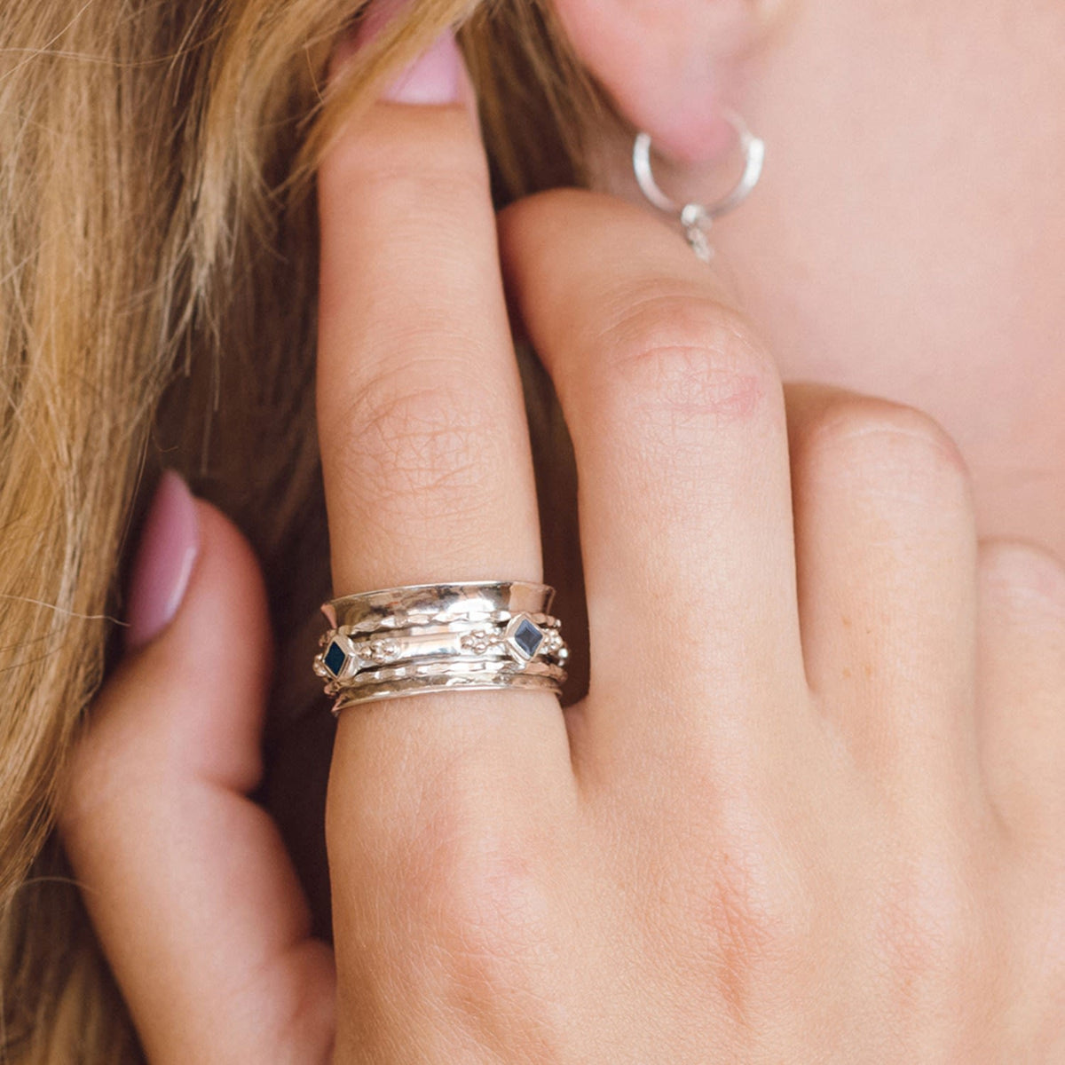 This Divinity Princess Silver Spinning Ring by Charlotte's Web Jewellery is an exceptional piece inspired by ancient Tibetan prayer wheels. Handcrafted with sterling silver and gently hammered inner rings, it is designed to relieve anxiety and stress. The princess-cut blue-violet iolite adds a hint of color and a touch of elegance, making it perfect for everyday wear.