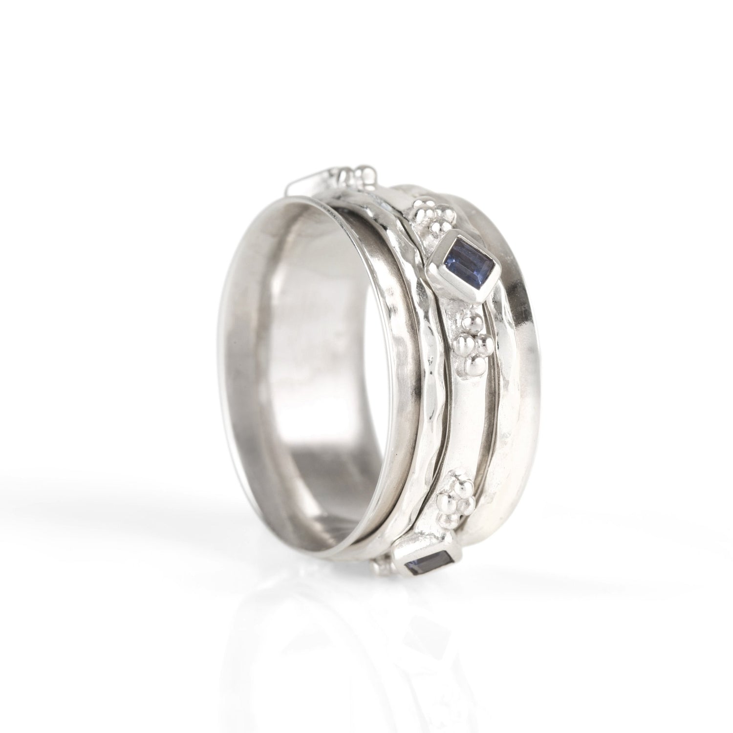 This handmade spinning ring is crafted from sterling silver and features a faceted iolite stone (0.25cm).