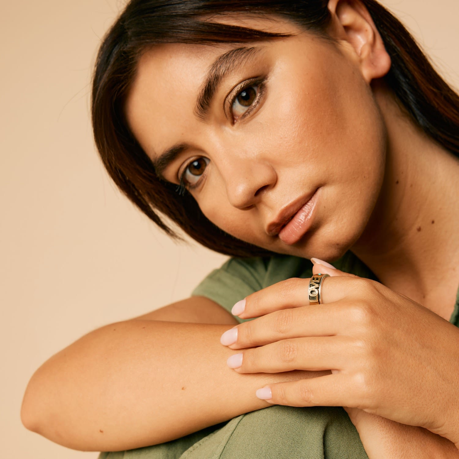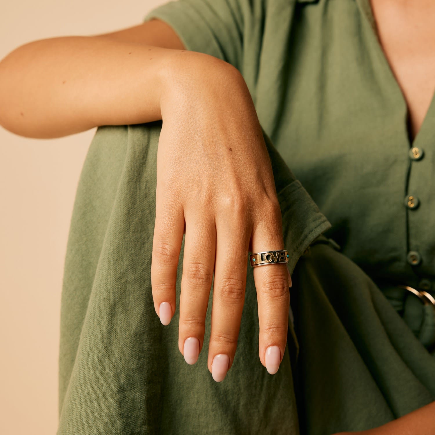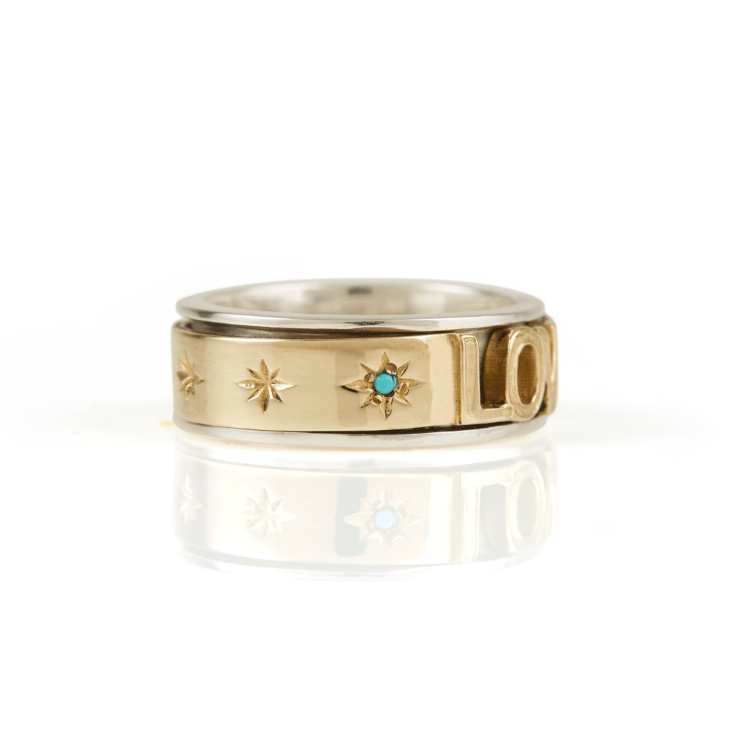 This Love Rocks Silver Spinning Ring by Charlotte's Web Jewellery is an edgy and eye-catching design that makes a bold statement. The spinning, hand-hammered bands are strikingly embellished with turquoise and star engravings. Inspired by ancient Tibetan meditation techniques, this ring offers a calming effect while making a unique style statement.