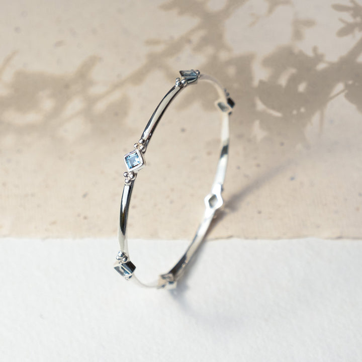 This bangle is handmade from sterling silver and features faceted blue topaz gemstones (0.4cm x 0.4cm). All stones are genuine.
