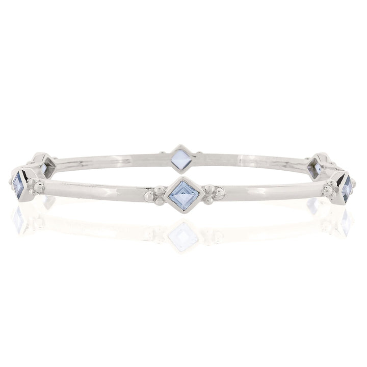 This Divinity Princess Silver Bangle with Blue Topaz by Charlotte's Web Jewellery is a stylish stacking bangle with a luxury feel. It's beautifully embellished with six genuine sky blue topaz gemstones in a square, princess-cut shape. The decorative silver embellishments on either side highlight the stones' natural radiance, making it a perfect accessory for any occasion.