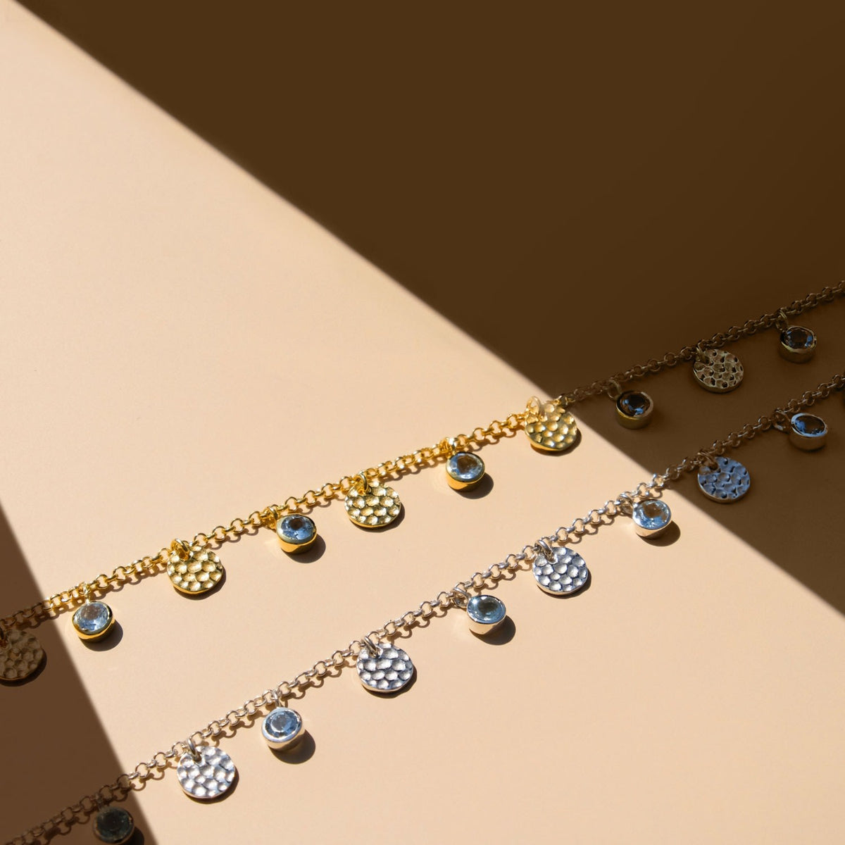 This Lakshmi Silver Necklace - Blue Topaz by Charlotte's Web Jewellery is a tribute to the Hindu Goddess Lakshmi and all powerful women who know their self-worth. It features a beautiful anchor link chain with tiny hammered discs and genuine blue topaz gemstones. This necklace is a spiritual piece that brings a touch of good fortune and prosperity to your everyday ensembles, making it a perfect gift for those born in November or December.