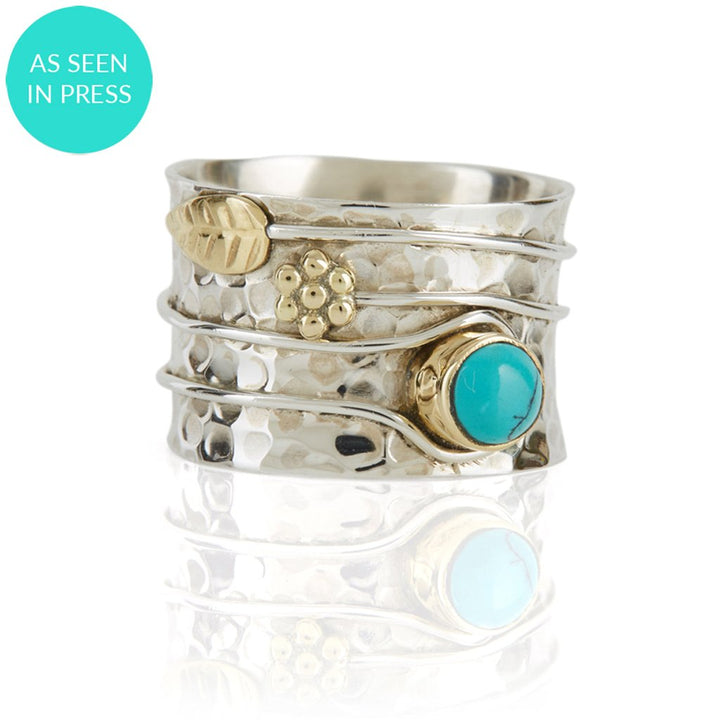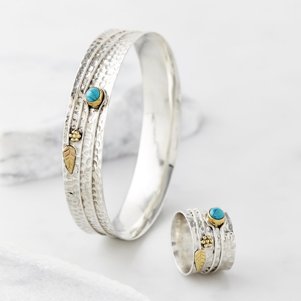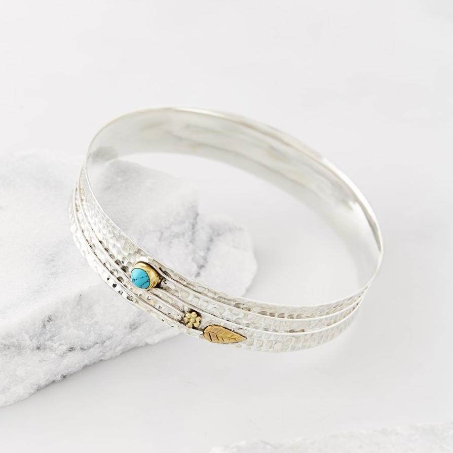 This Secret Garden Silver Bangle - Turquoise by Charlotte's Web Jewellery is a delightful handmade bangle inspired by enchanted forests. It is beautifully embellished with vines, leaves, and flowers, and features a vibrant turquoise gemstone, the birthstone for December. The bangle has hammered detailing and is a tactile treasure that manifests good fortune and success.
