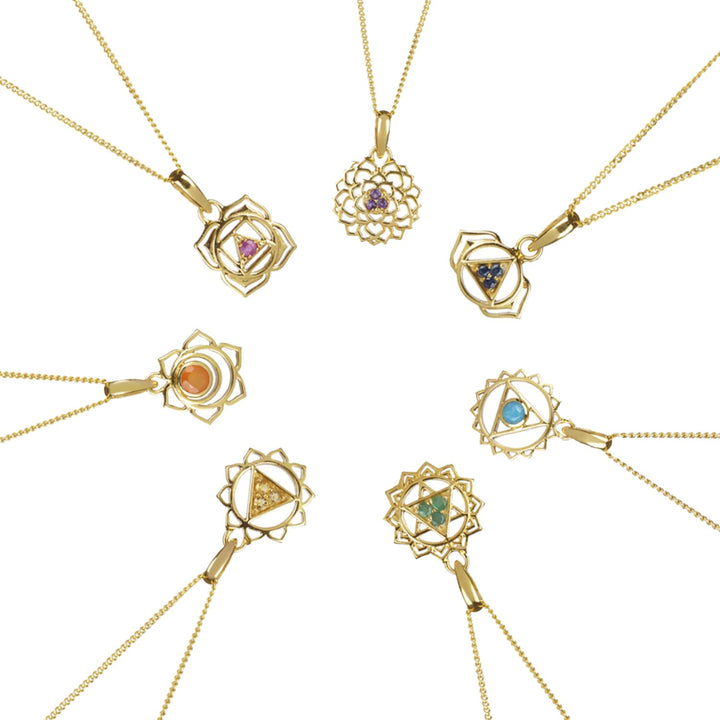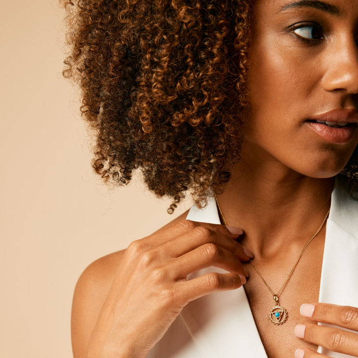 This Throat Chakra Gold Vermeil Necklace - Turquoise by Charlotte's Web Jewellery is a handmade necklace designed to embrace the healing powers of turquoise. Inspired by the seven chakra system, it features a diamond-cut curb chain and a throat chakra pendant. This intricately detailed necklace opens channels of self-expression and is a stunning addition to any outfit.